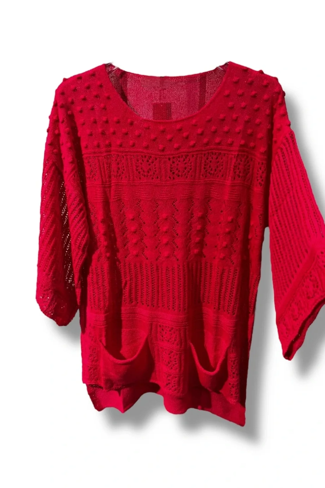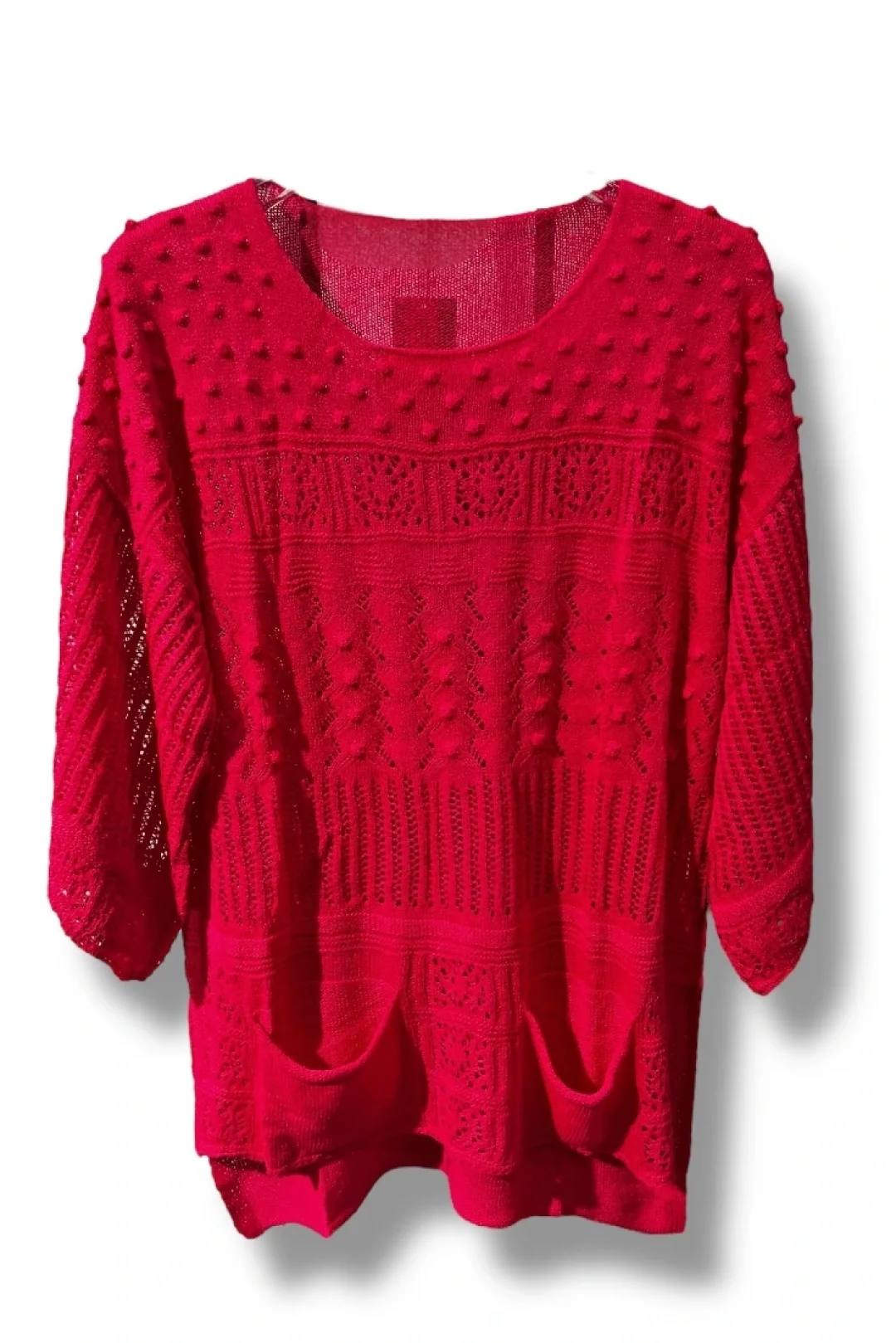 Nefes alan merserize iplik sayesinde hafif, dayanıklı ve dört mevsime uygun bir yapıya sahiptir. Ön bölümdeki kabartmalı örgüler ve ajurlu desenler bluze estetik bir hava katarken, alt kısımdaki çift cep detayı fonksiyonel bir tasarım sunar.