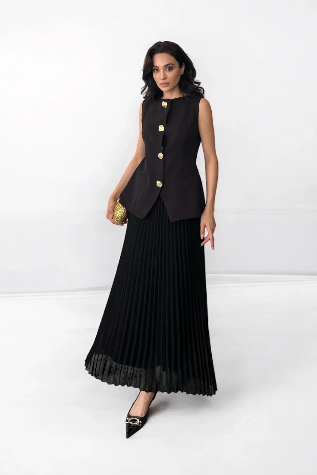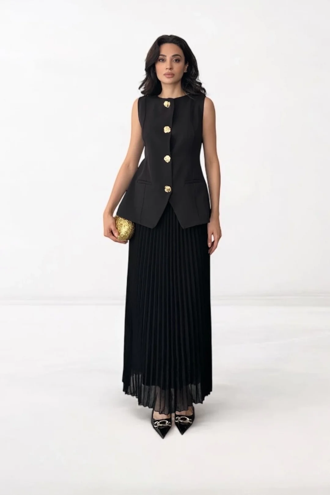 Altın düğme detaylı kolsuz üst kısmı, güçlü bir duruş sergilerken; hafif dökümlü, pliseli şifon etek ise feminen bir zarafet sunar. Davetlerden özel günlere, ofis şıklığından kokteyllere kadar geniş kullanım alanına sahiptir.