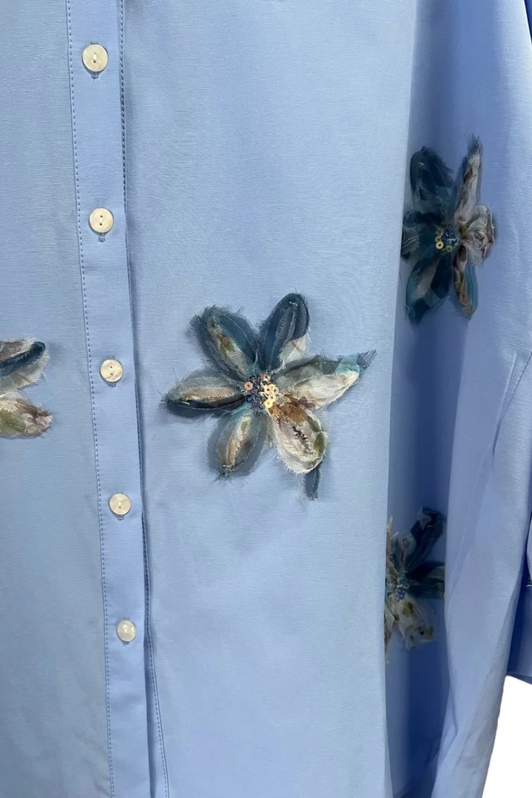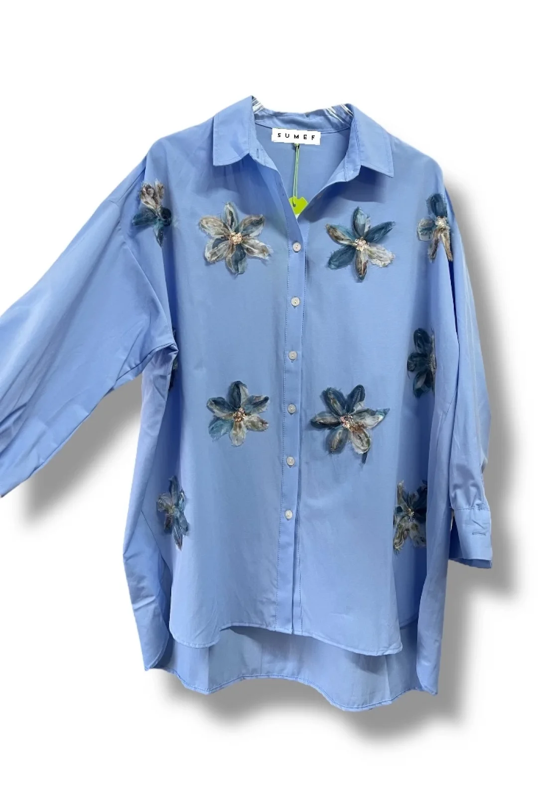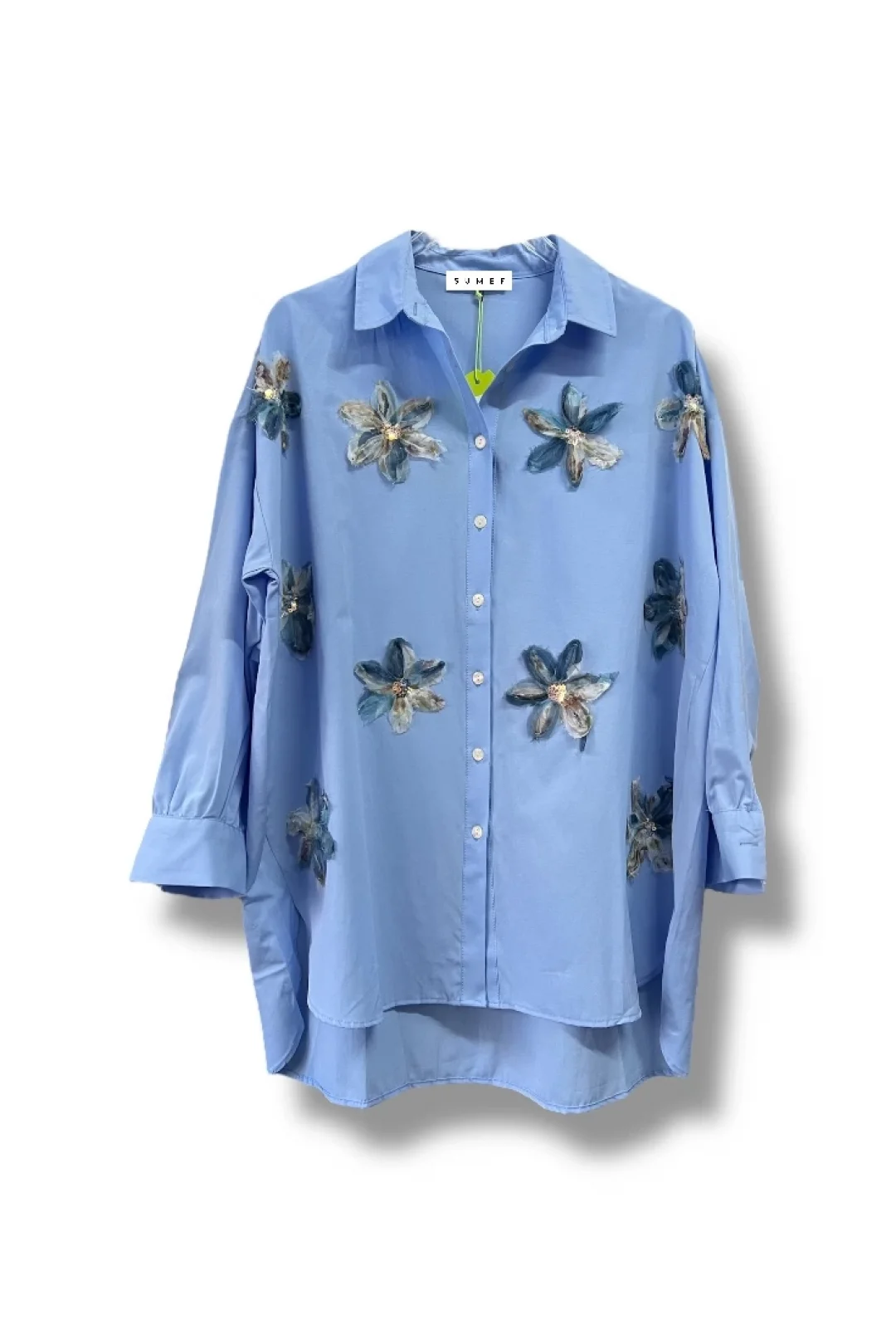 Poplin kumaş üzerine çiçek aksesuar detaylı oversize gömlek. standart 38/46 bedenlere uygundur.