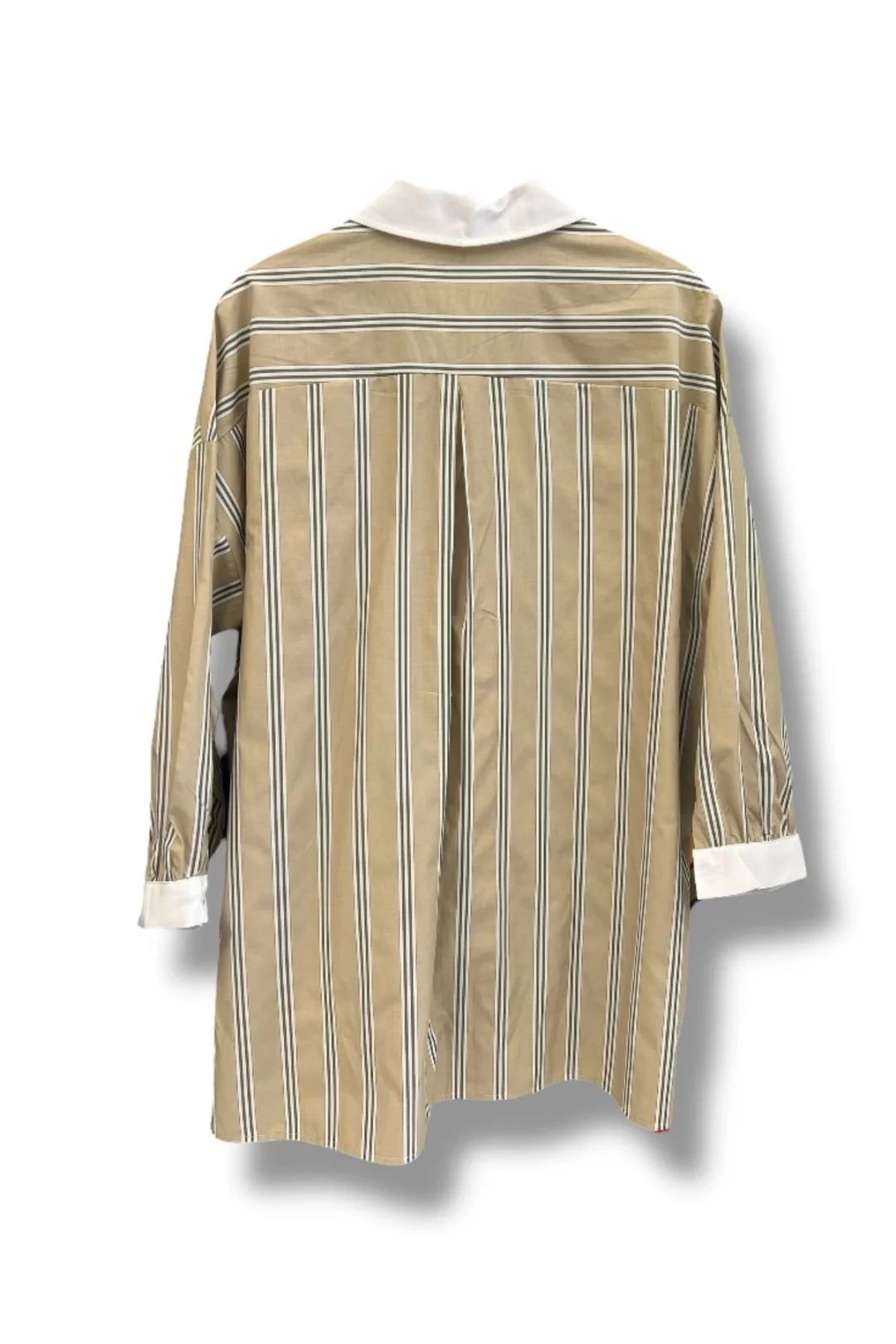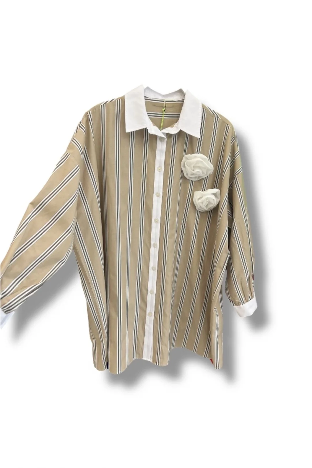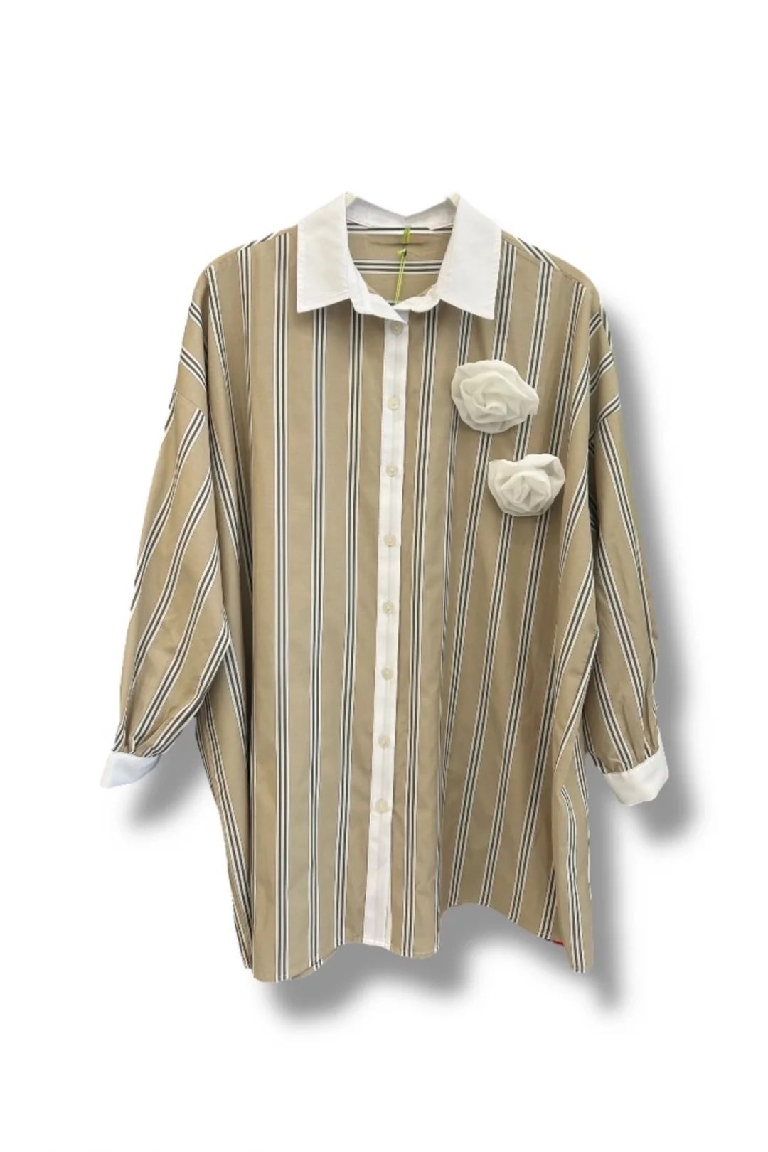 Çizgili Gül Detaylı Oversize Geniş Kesim Gömlek-Bej