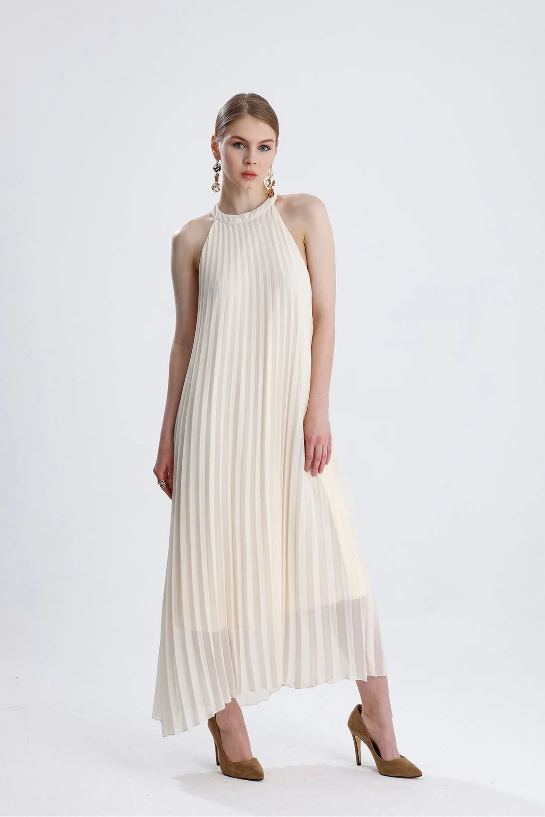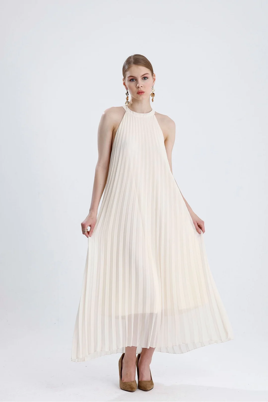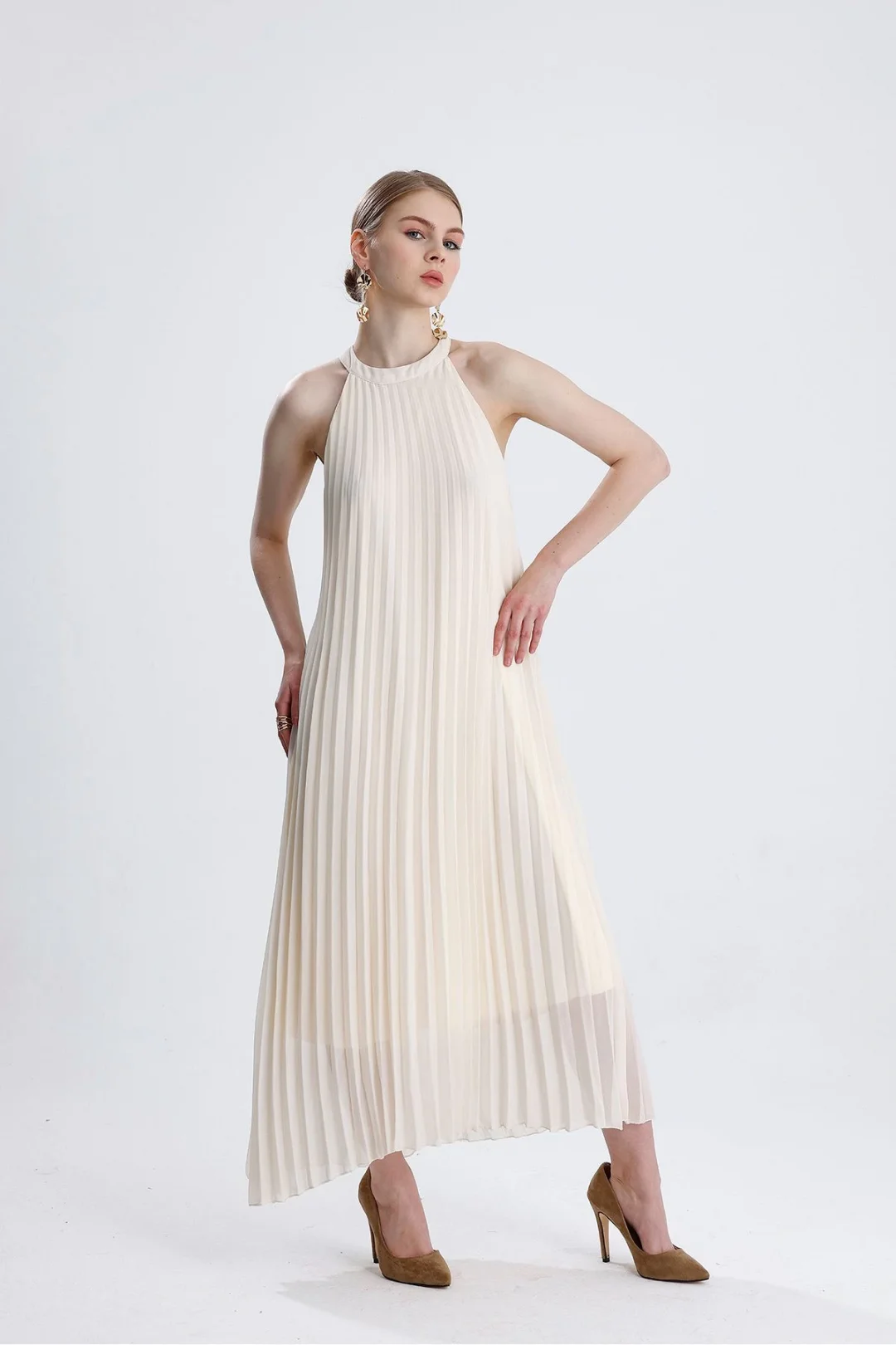 Halter yaka pliseli dökümlü elbise