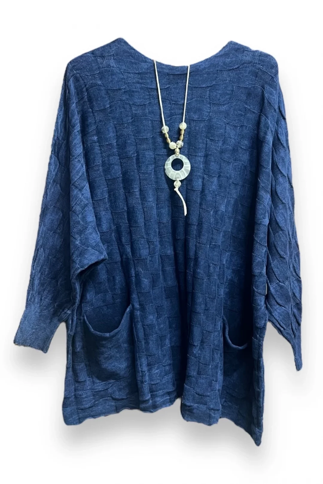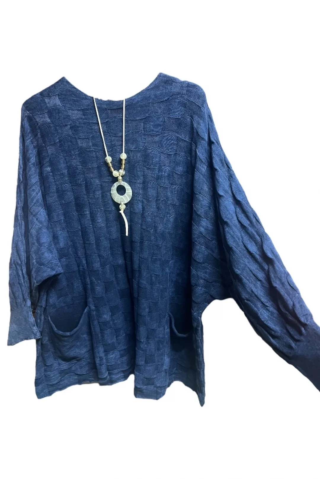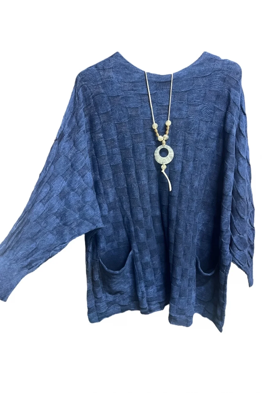 38–48 Beden Uyumlu Merserize Triko Bluz - Dokulu Desenli Mavi