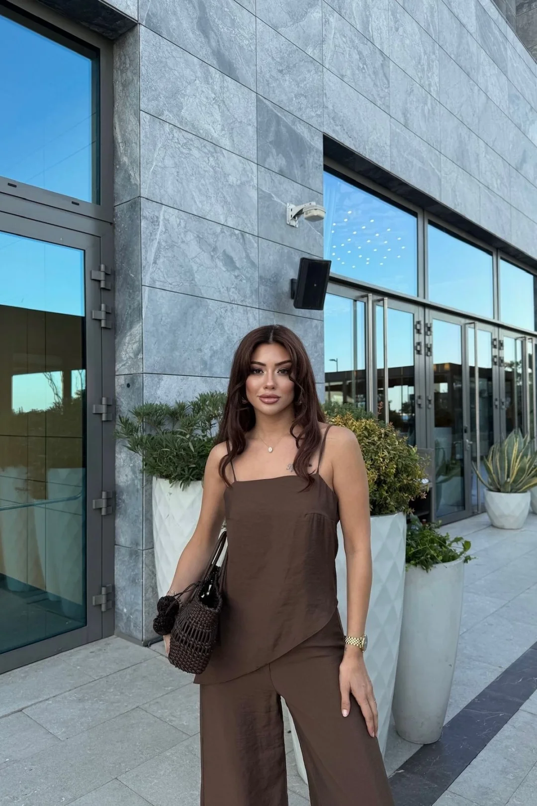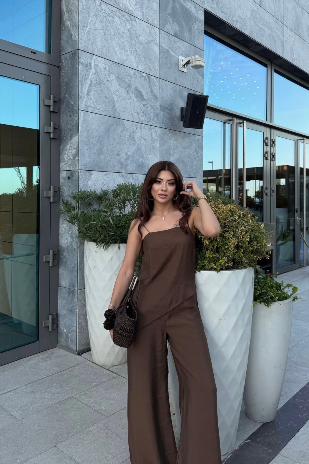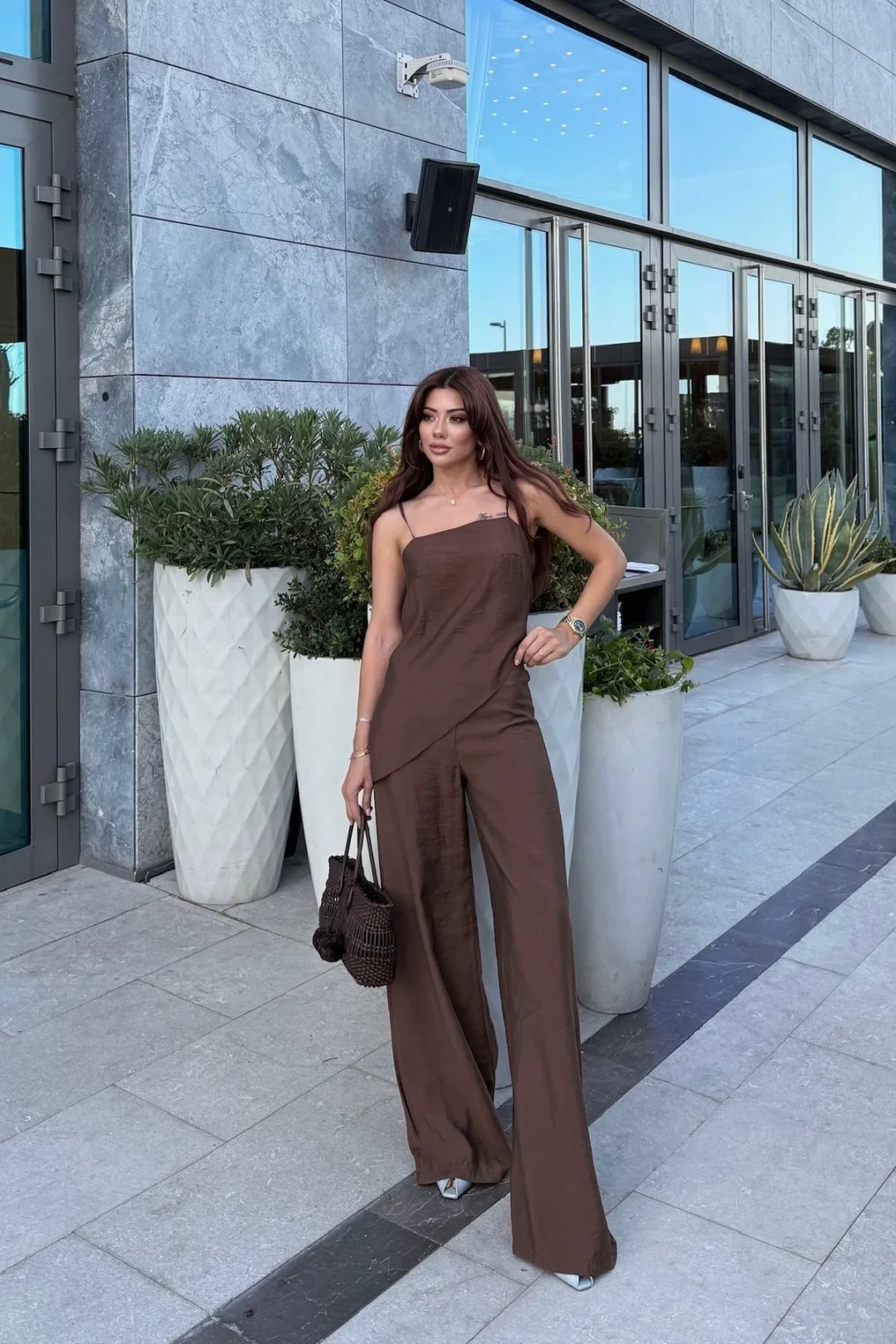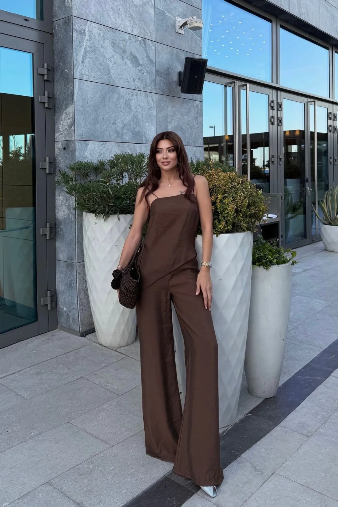 Minimal ve modern tasarımıyla dikkat çeken bu kahverengi ikili takım, yaz aylarında vazgeçilmez parçanız olacak. Hafif ve dökümlü kumaşı sayesinde ferah bir kullanım sunarken, lastikli pantolonu ile gün boyu konfor sağlar. Üst kısmın zarif askılı ve asimetrik kesimiyle şık ve özgün bir görünüm elde edebilirsiniz.