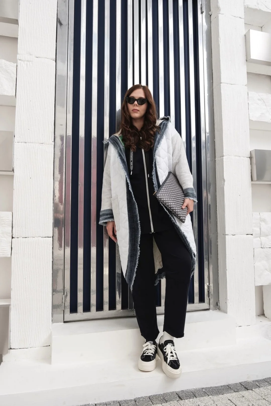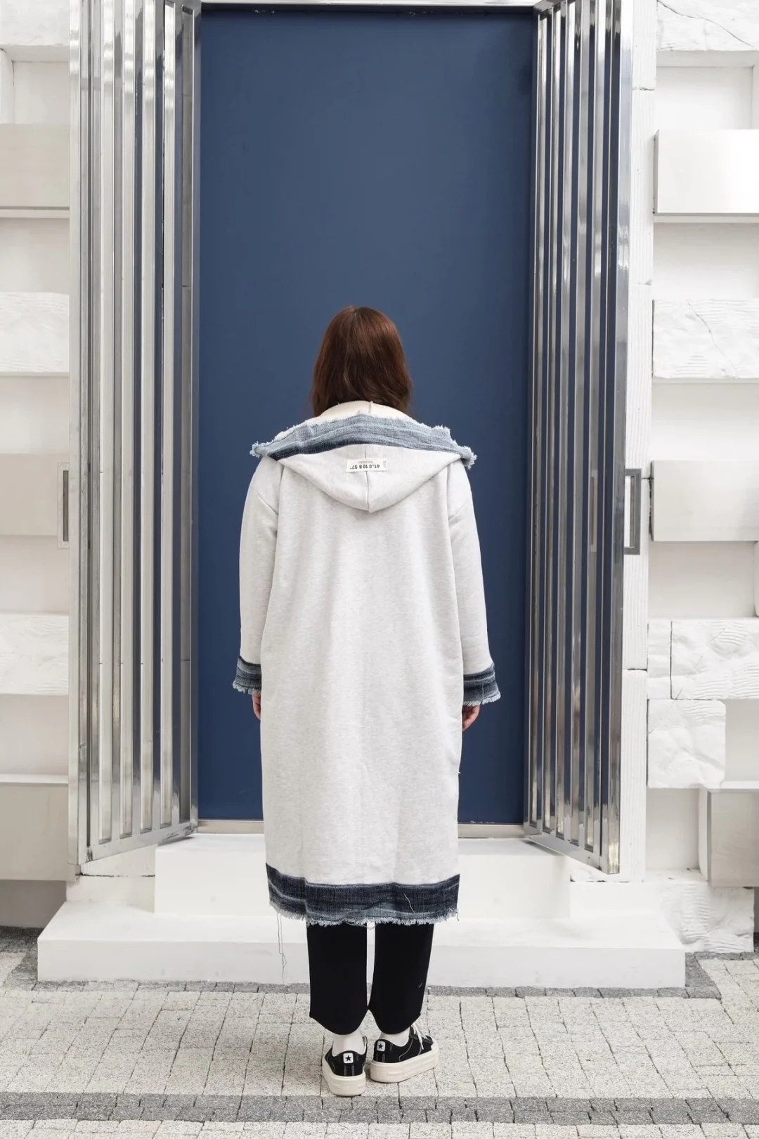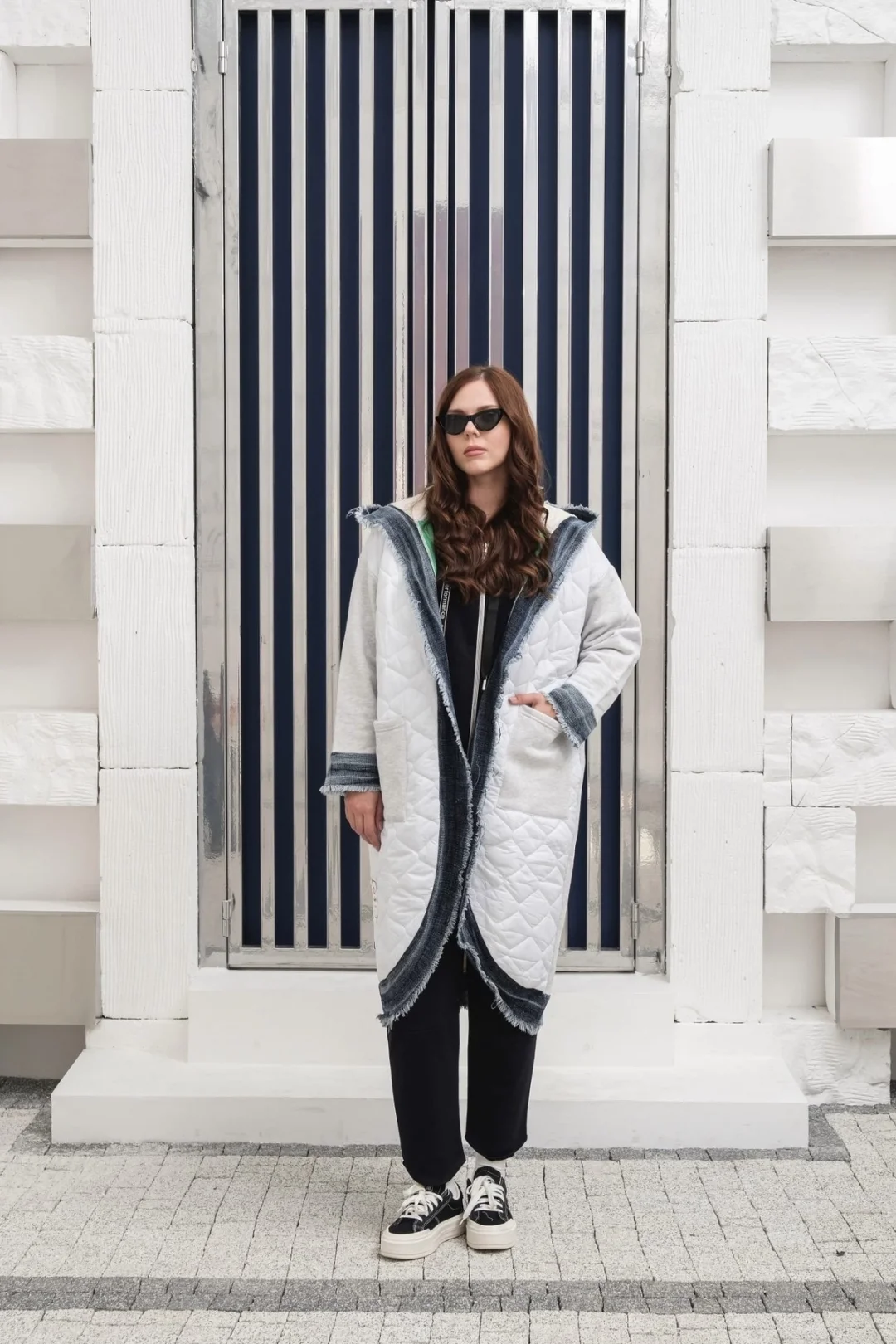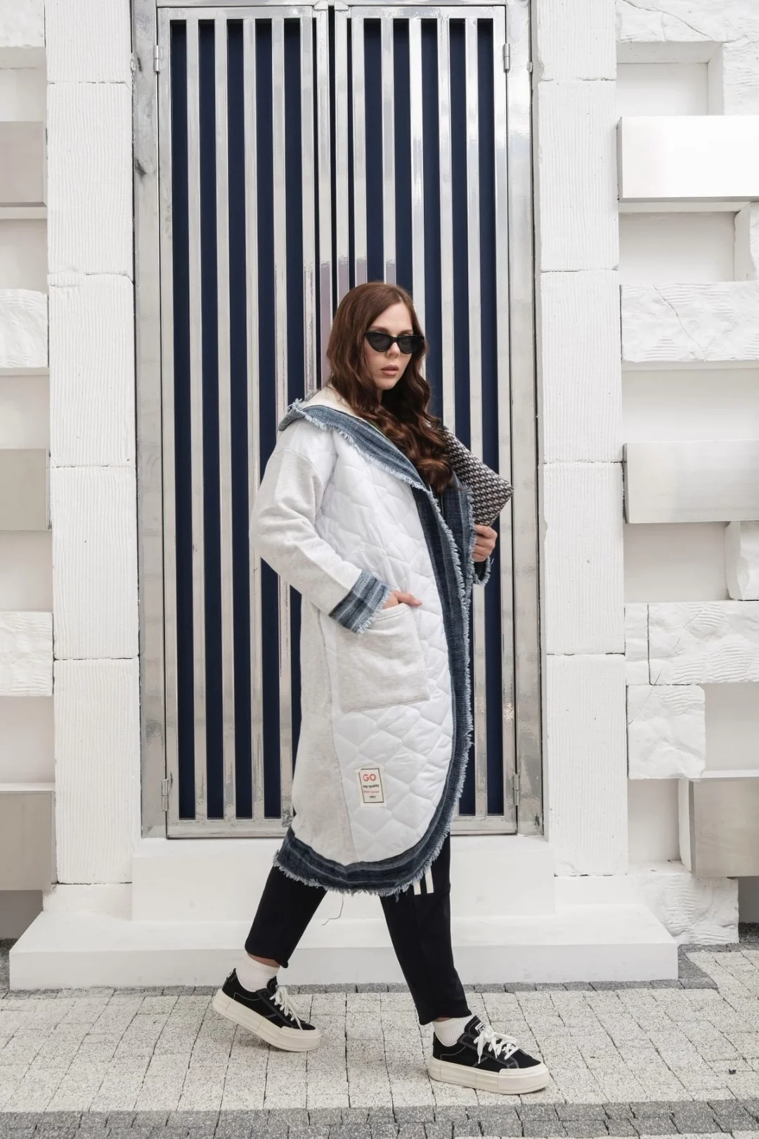 İki cepli yıkamalı kare desen pamuk triko-Gri