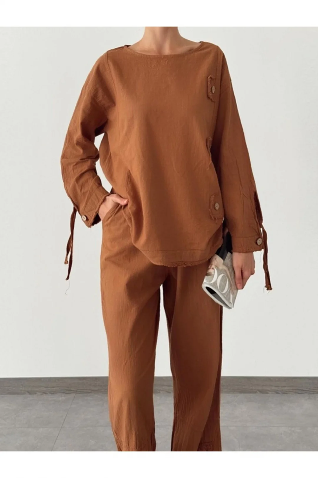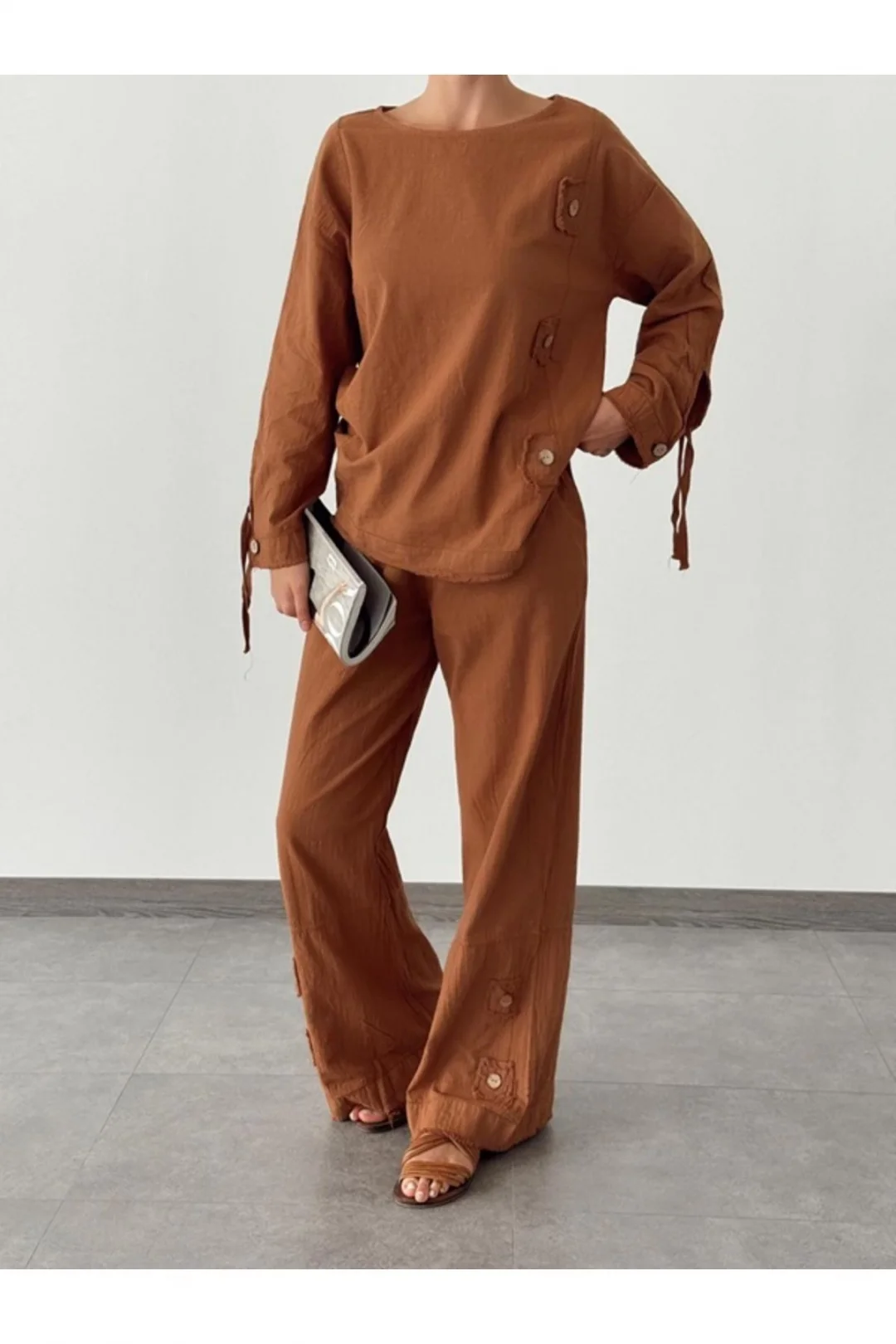 Kadın Pamuklu Düğmeli Bluz ve Pantolon Takımı Üst giyim;