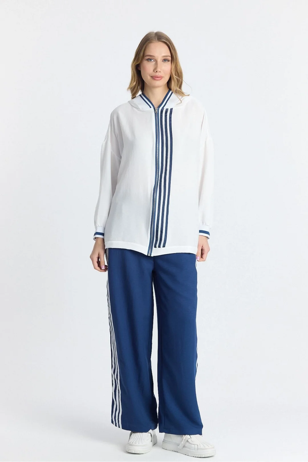 Kapüşonlu şeritli oversize eşofman takımı 38/46 beden arası uyumludur.