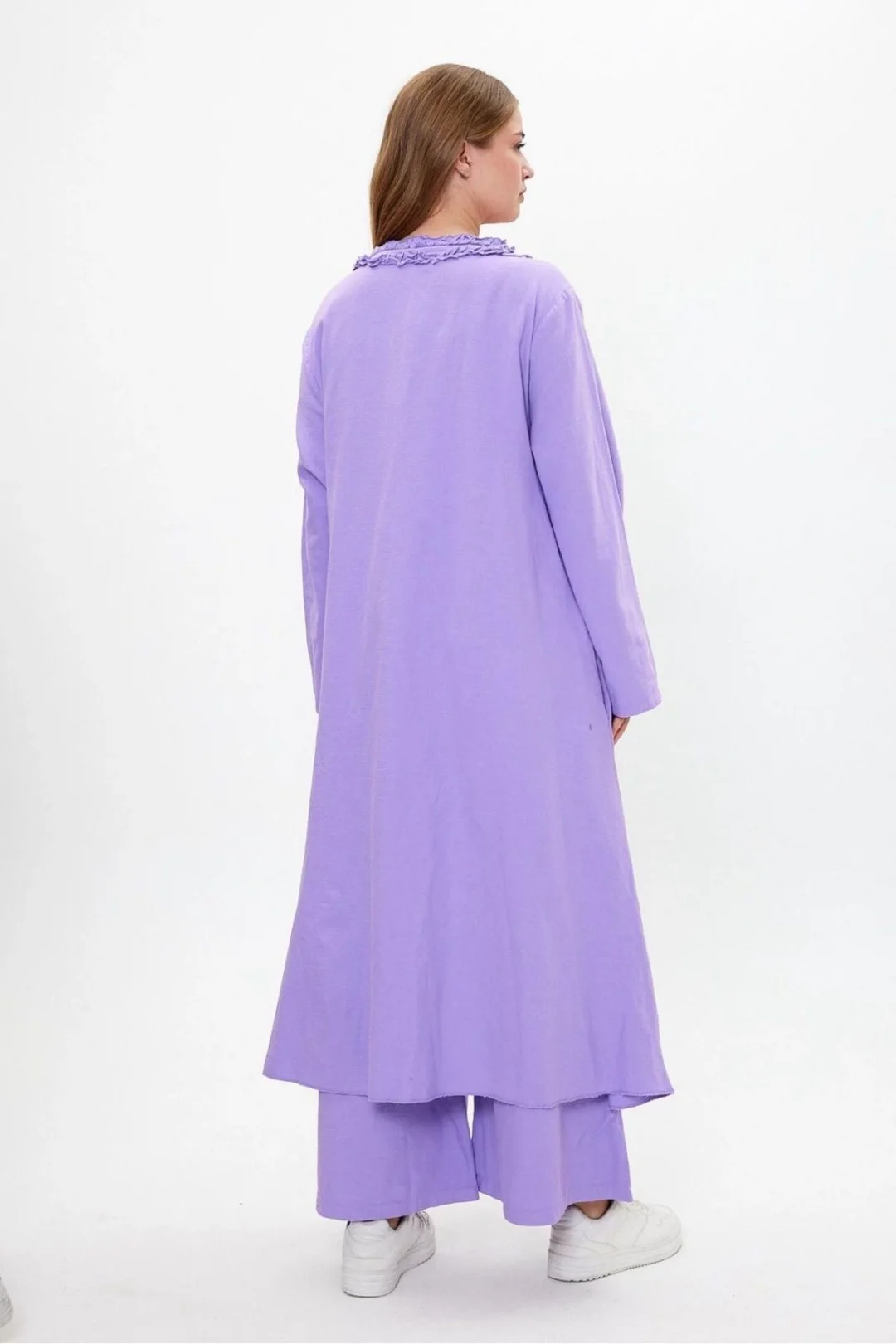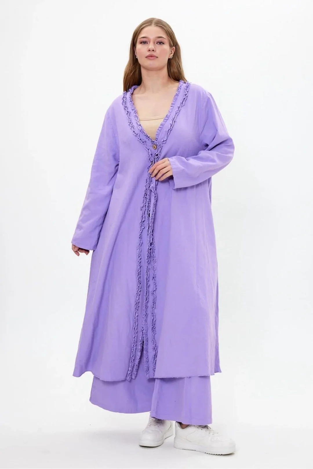 Şıklığı ve rahatlığı bir arada sunan SUMEF marka keten tek düğmeli fırfılı oversize ikili takım ile tarzınızı konuşturun. Bu takım, hem günlük kullanıma hem de özel davetlere uygun bir seçenek sunar.