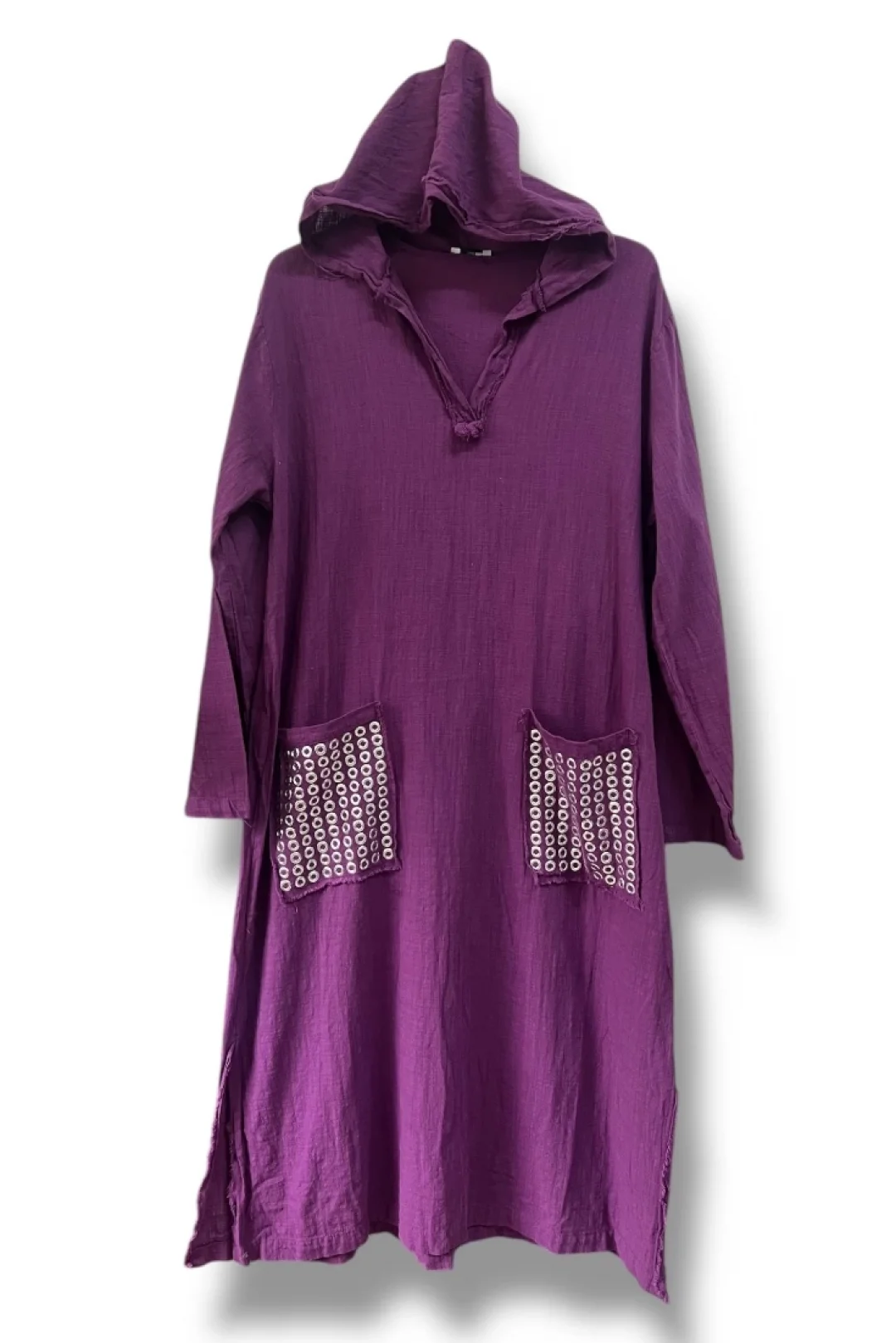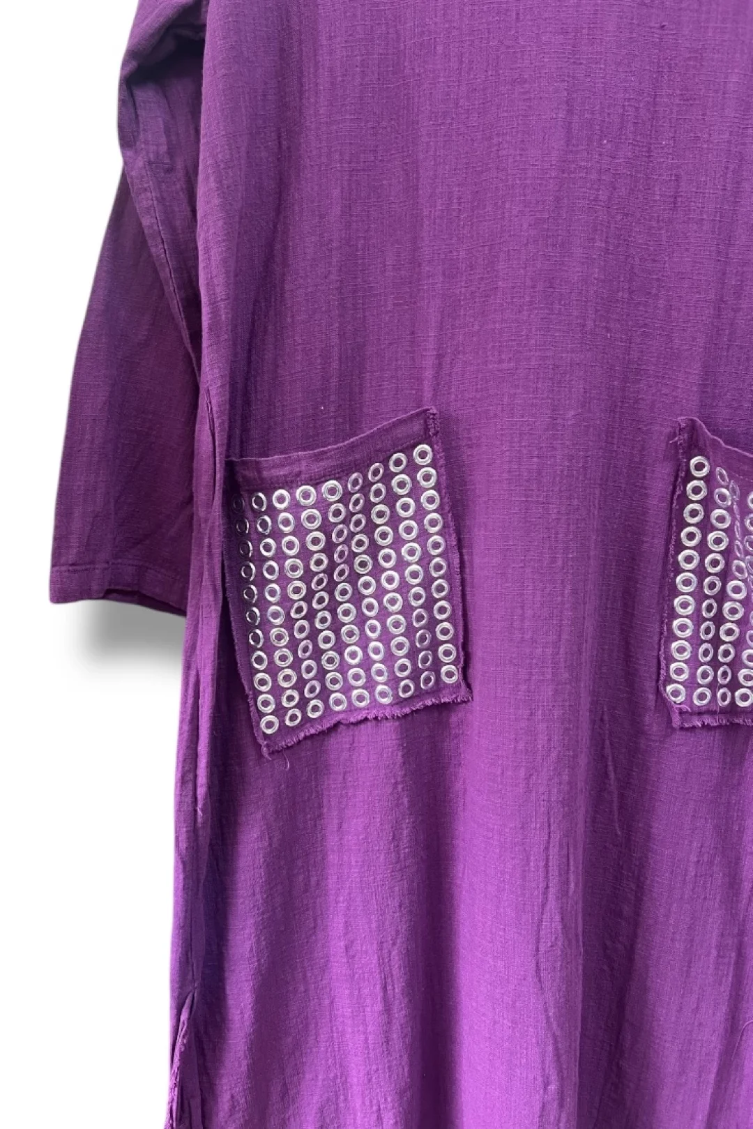 Kuş gözü detaylı çift cep organik pamuk elbise-Mor
