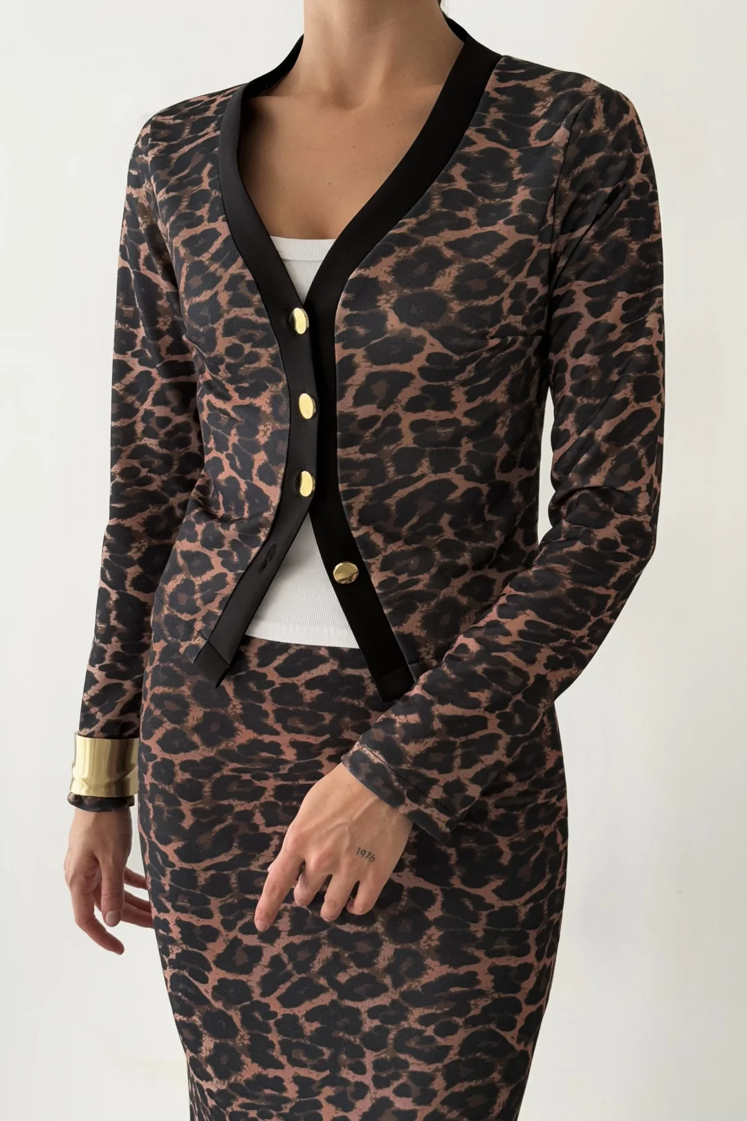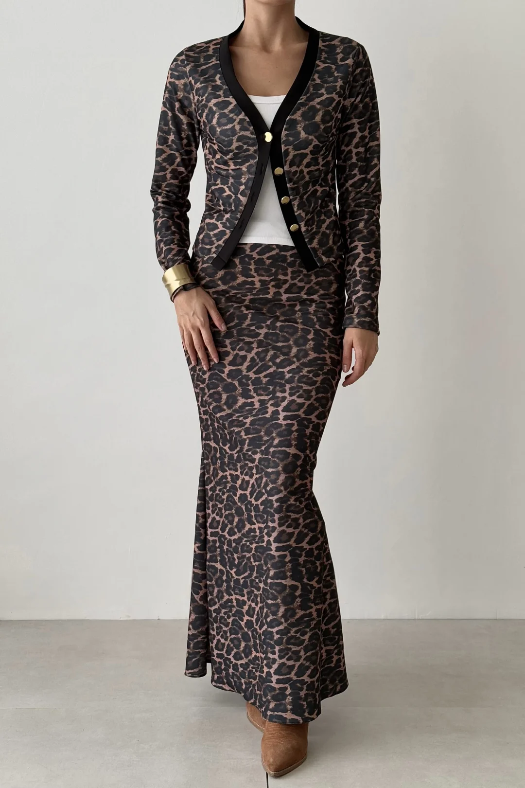 Sumef marka leopar desenli hırka etek takımı, şıklığı ve trendi bir arada sunar.