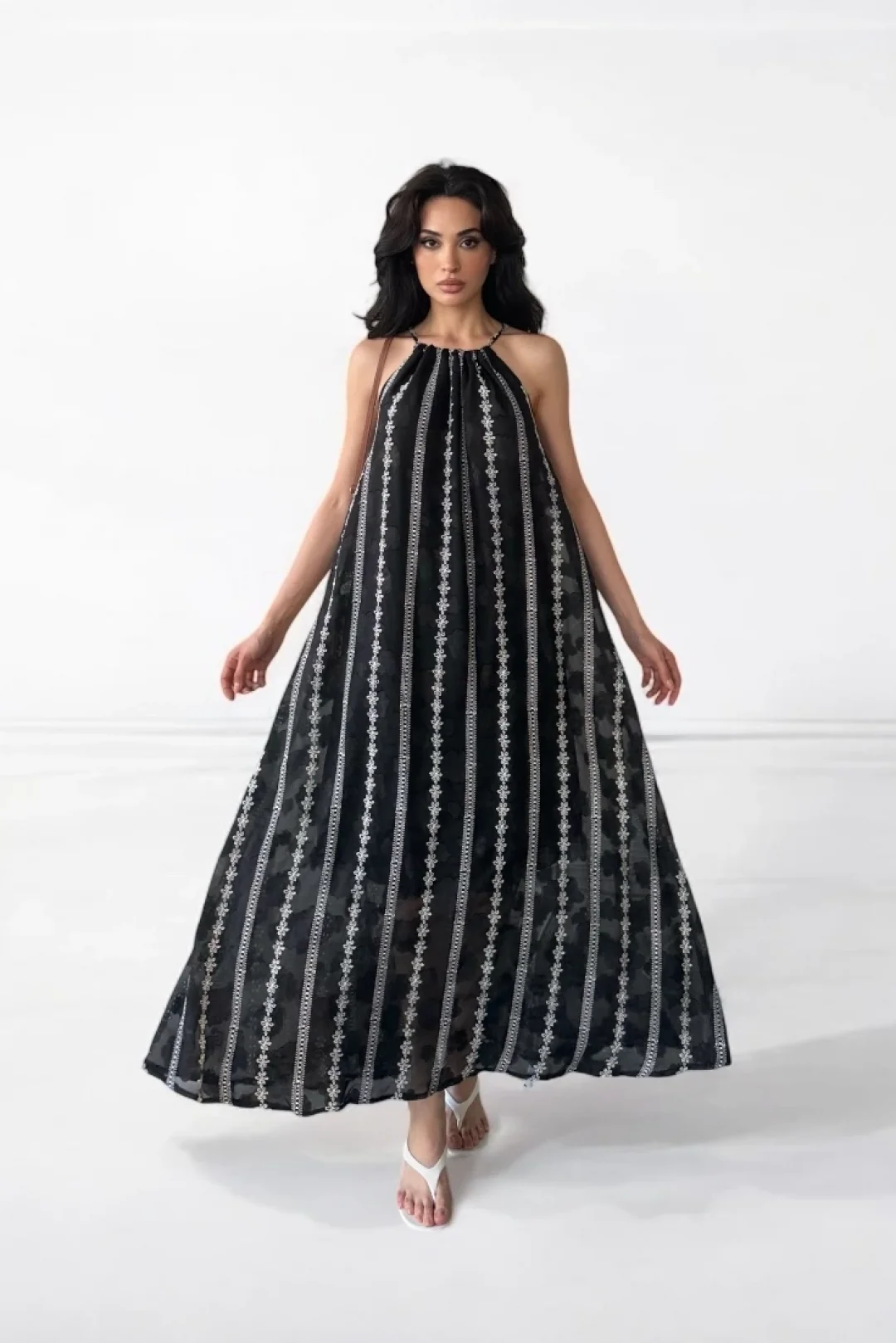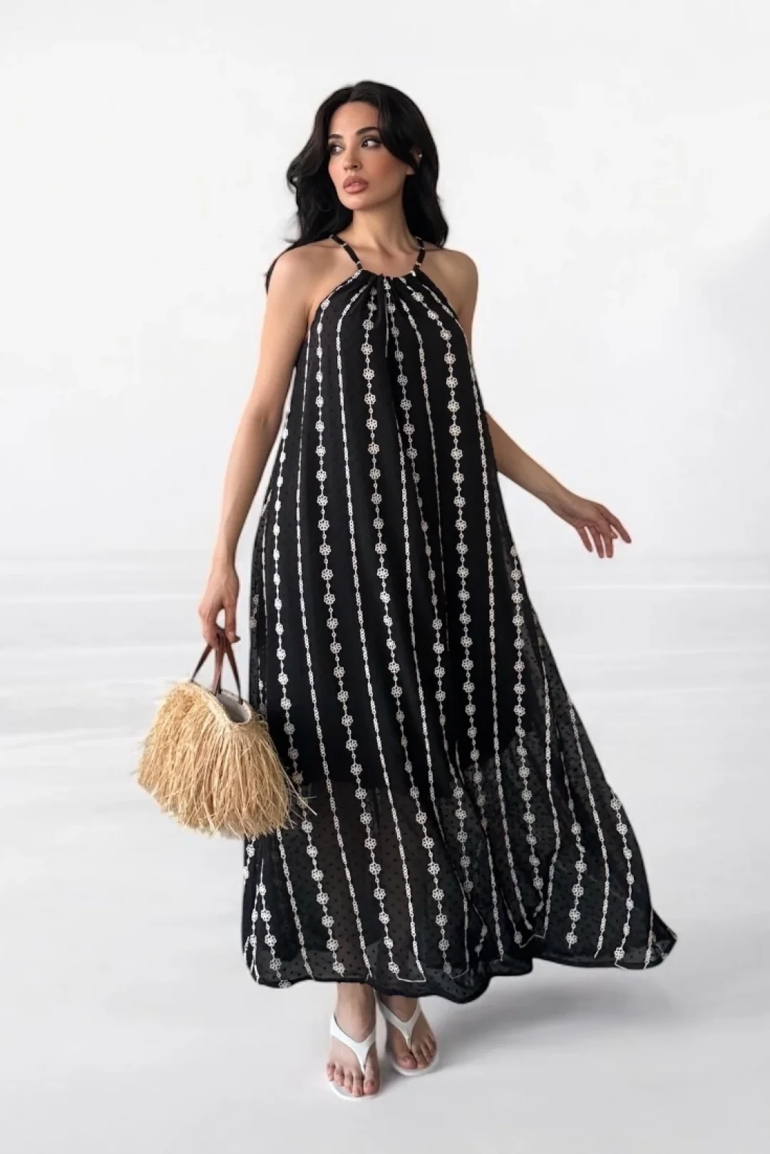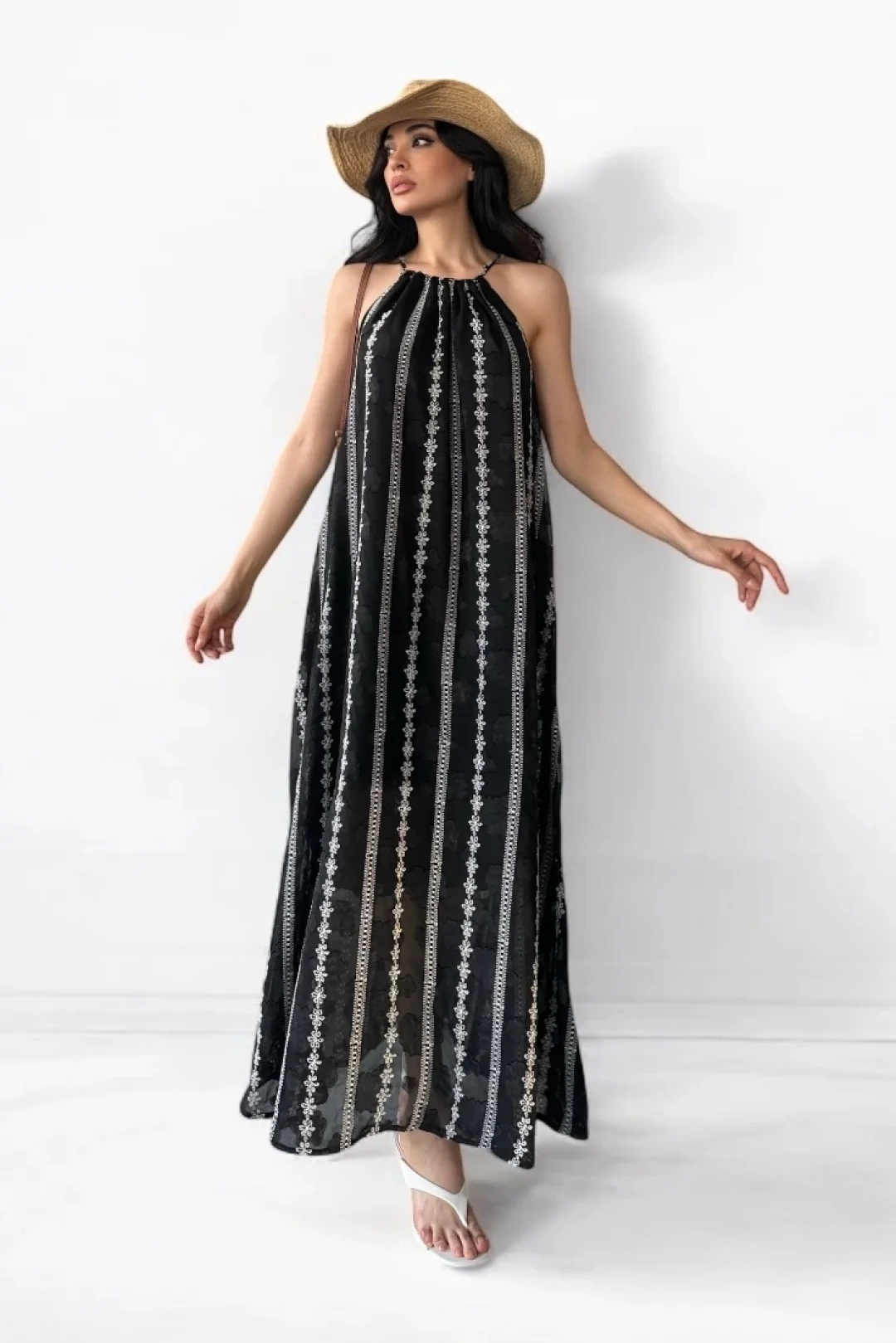 Bohem şıklığı zarafetle buluşturan bu nakış detaylı şifon maxi elbise, yaz aylarının vazgeçilmez parçası olmaya aday!