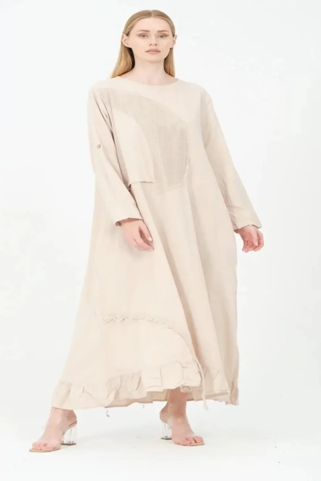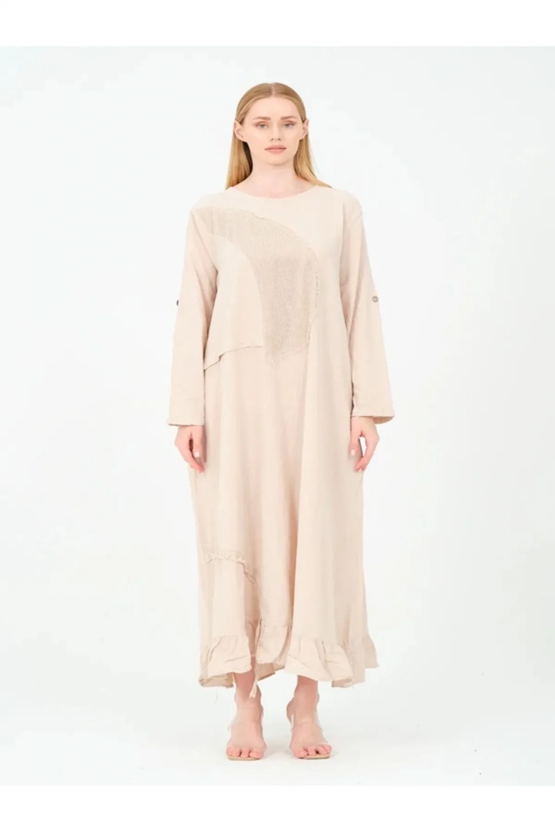 Pamuk File Detaylı Elbise-Bej