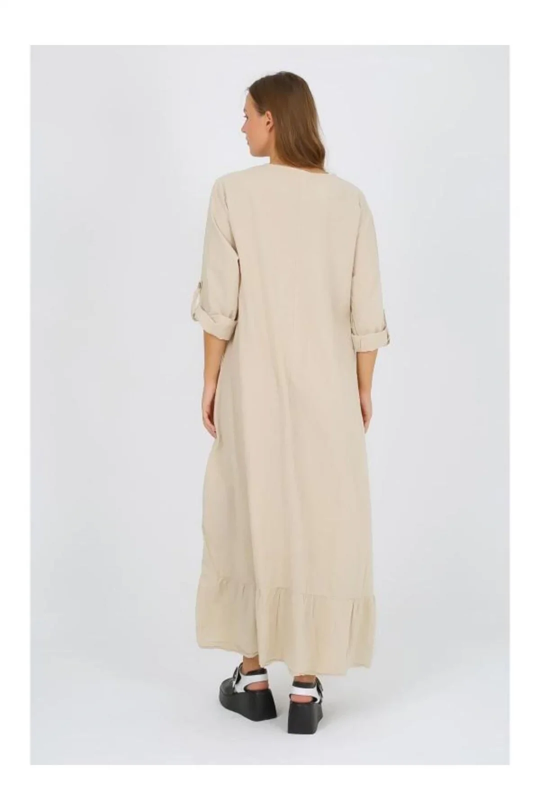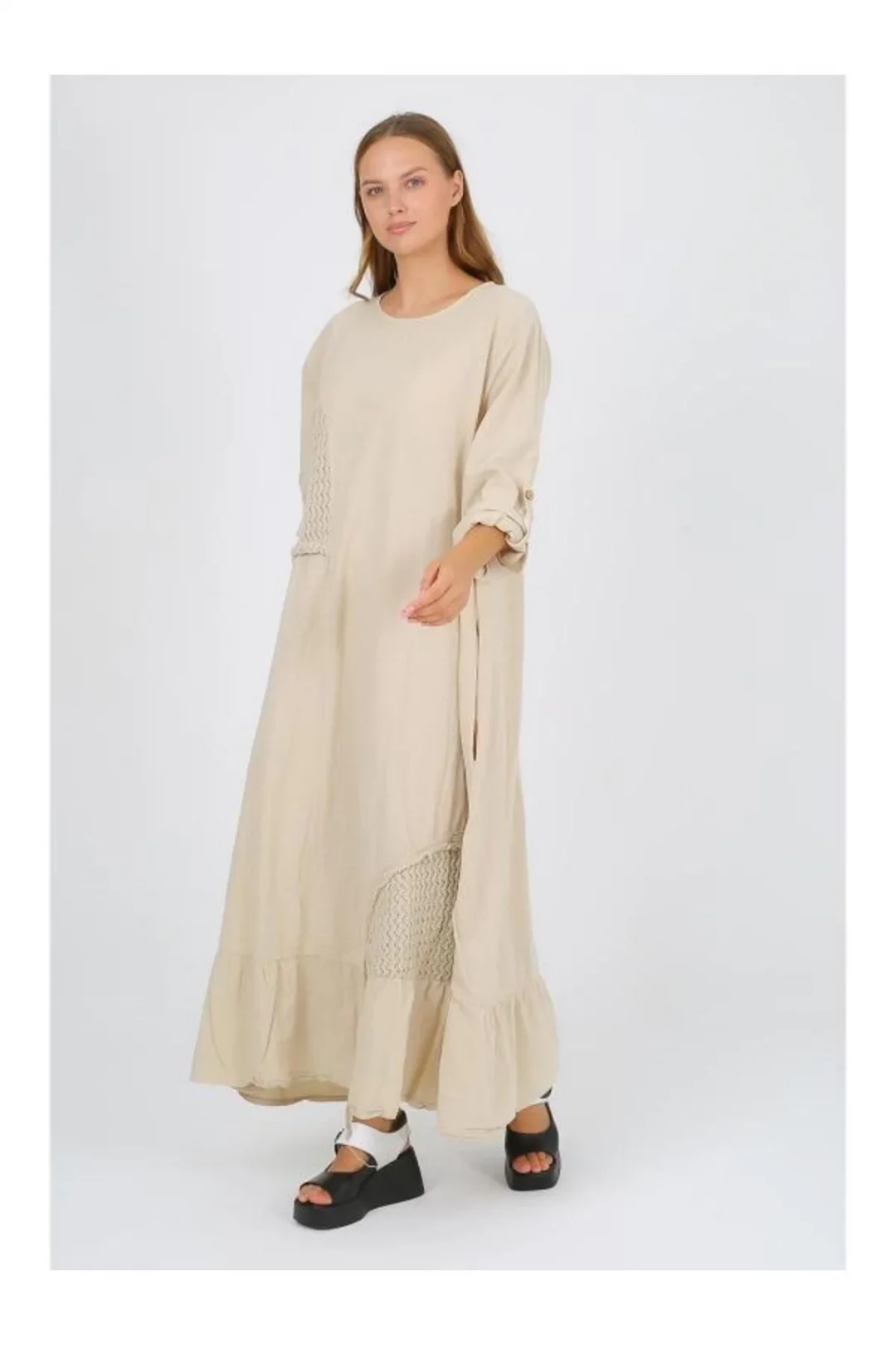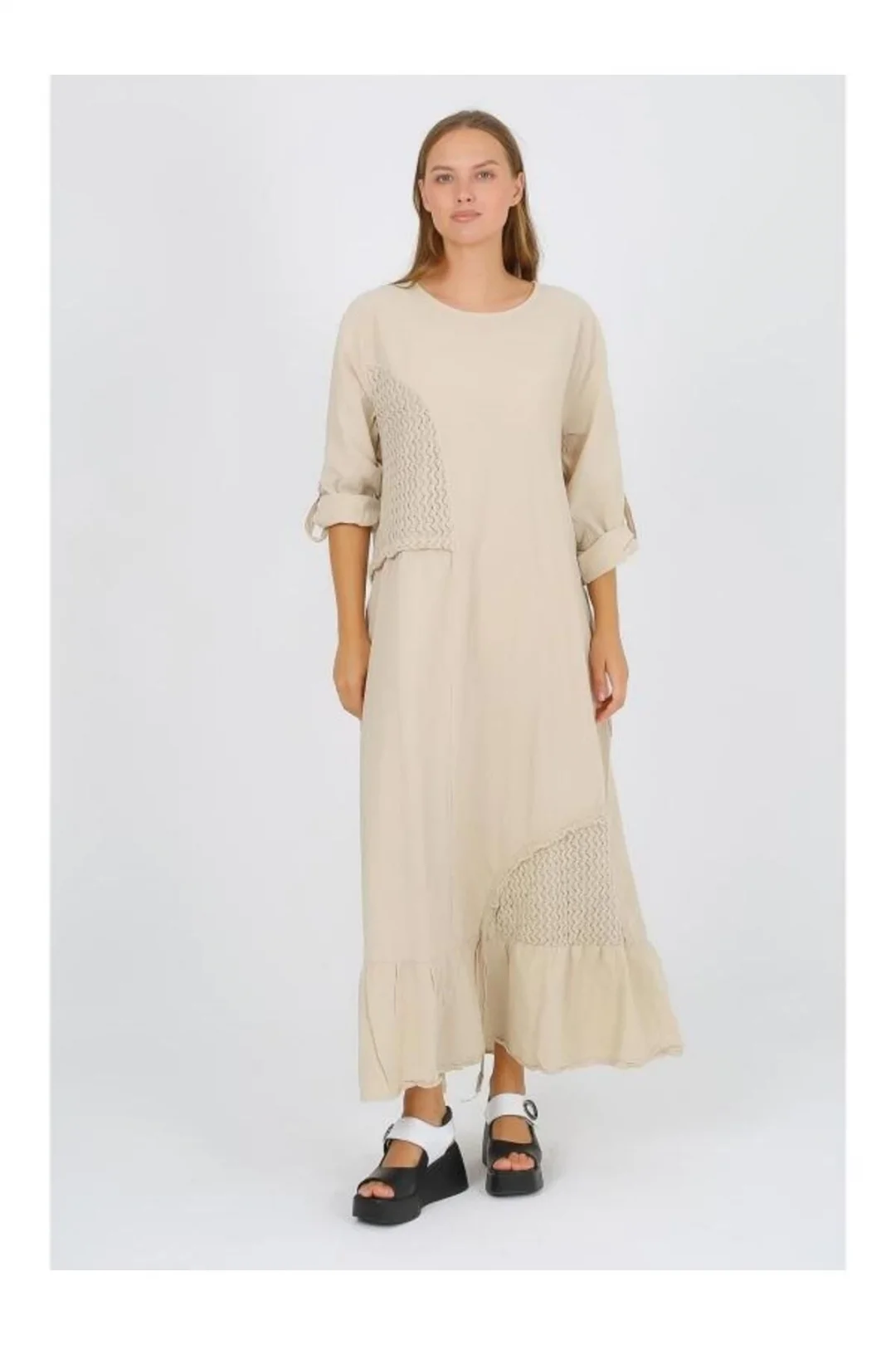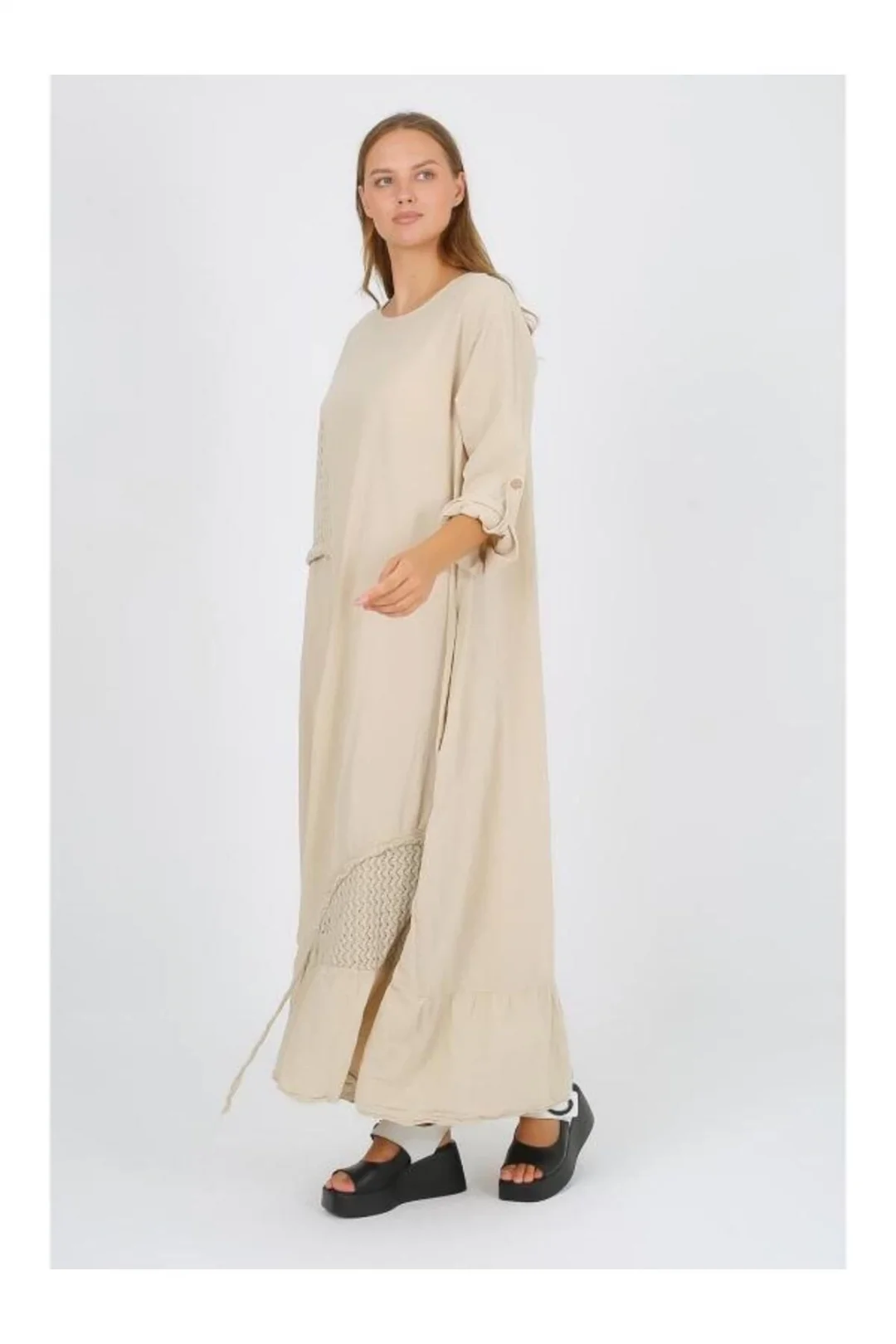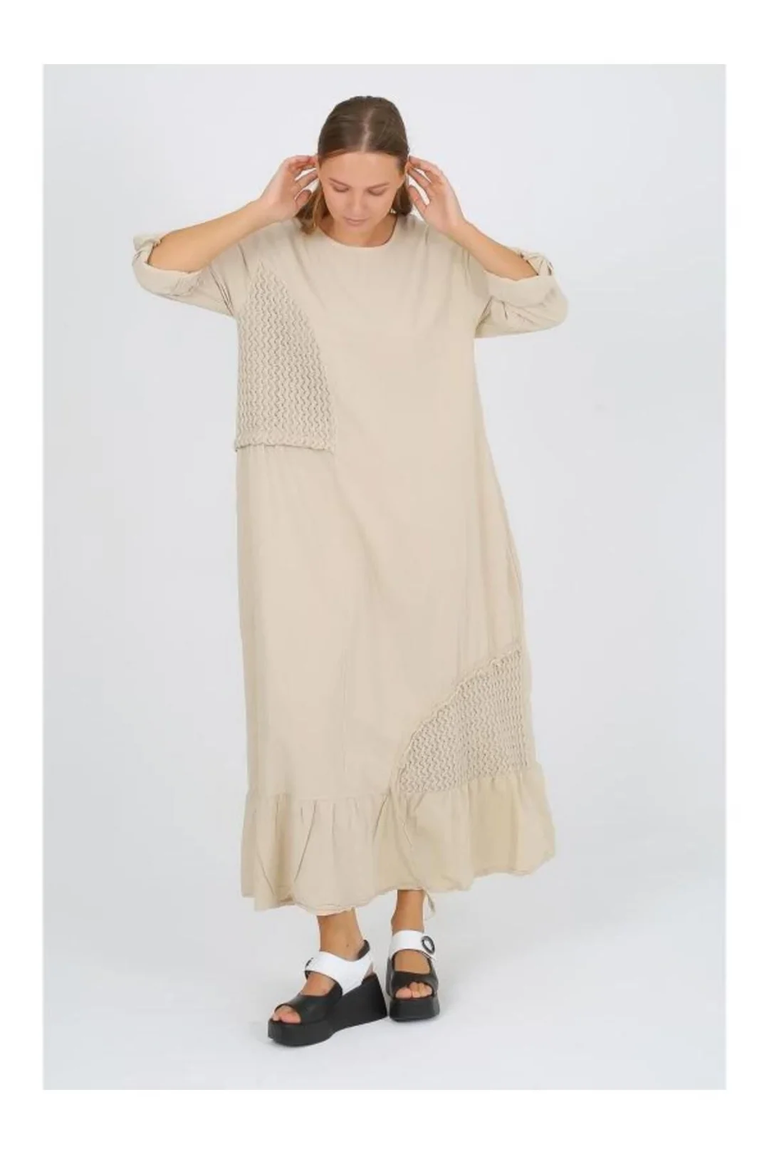 Pamuklu Kadın Uzun Tam Boy Triko Detaylı Elbise-Bej