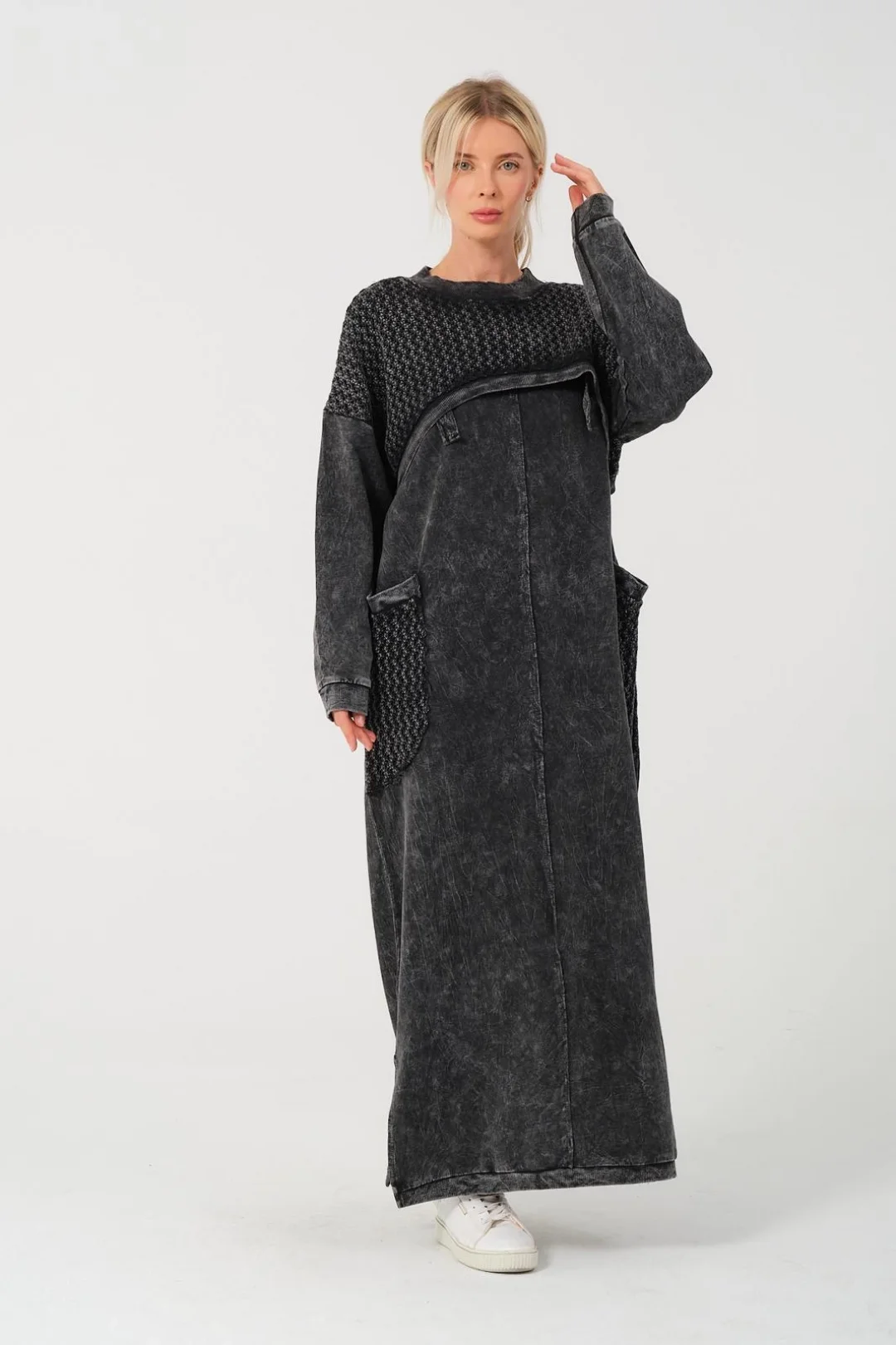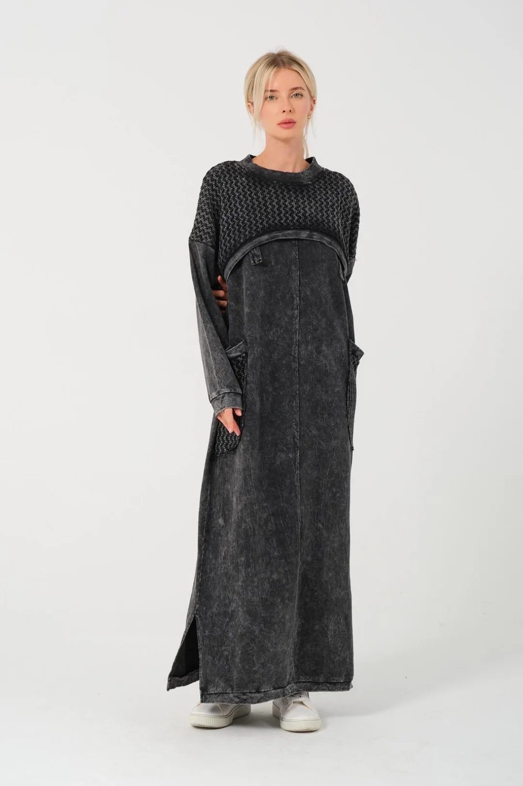 Pamuk V Yaka Yırtmaçlı Uzun Elbise-siyah