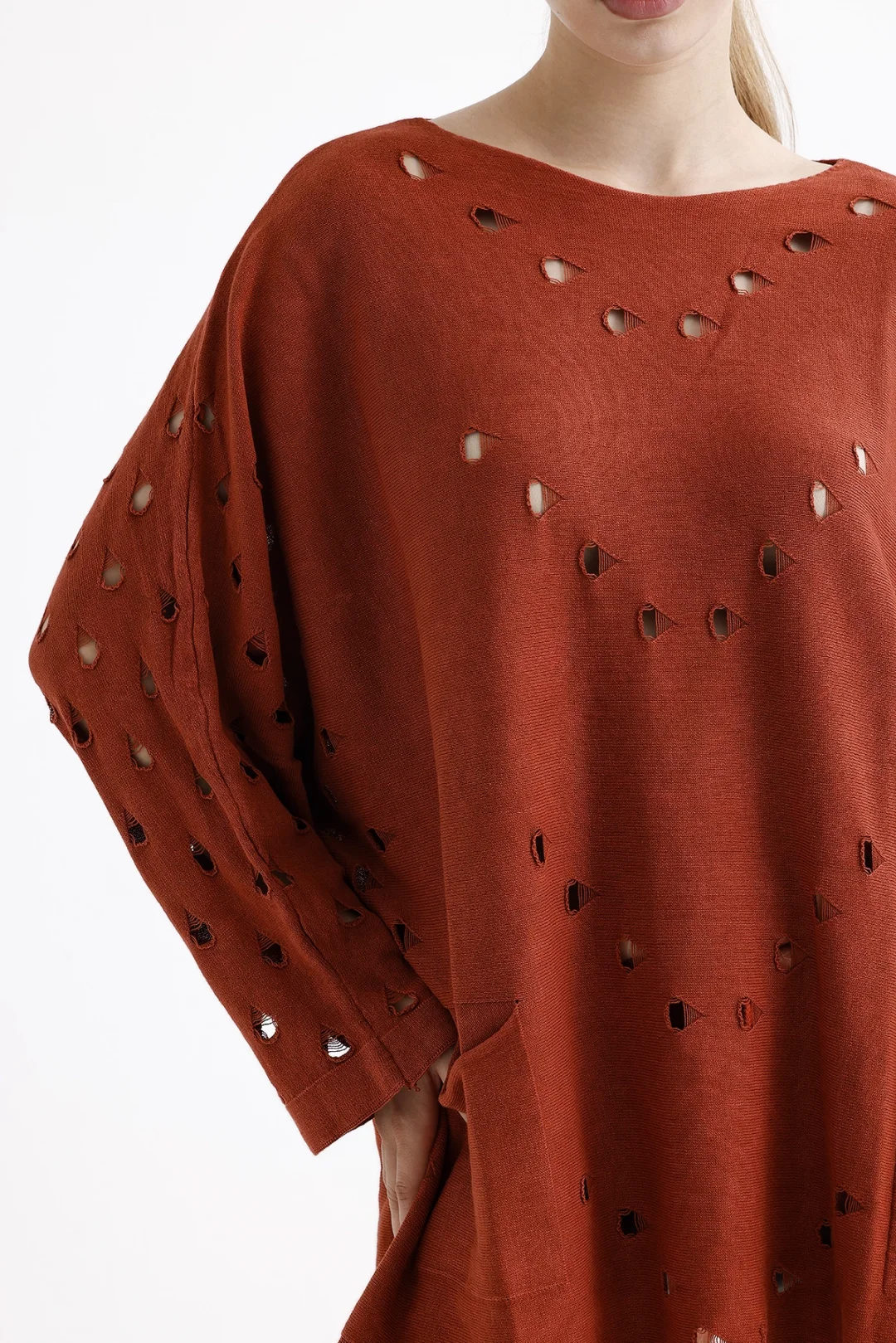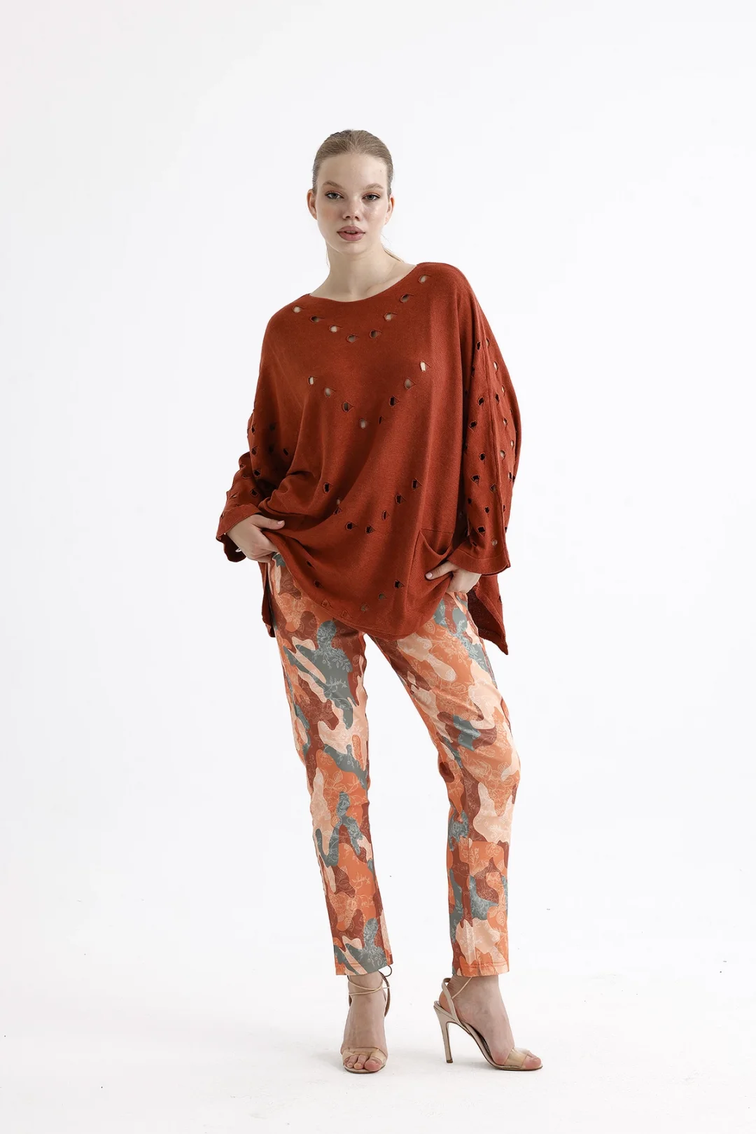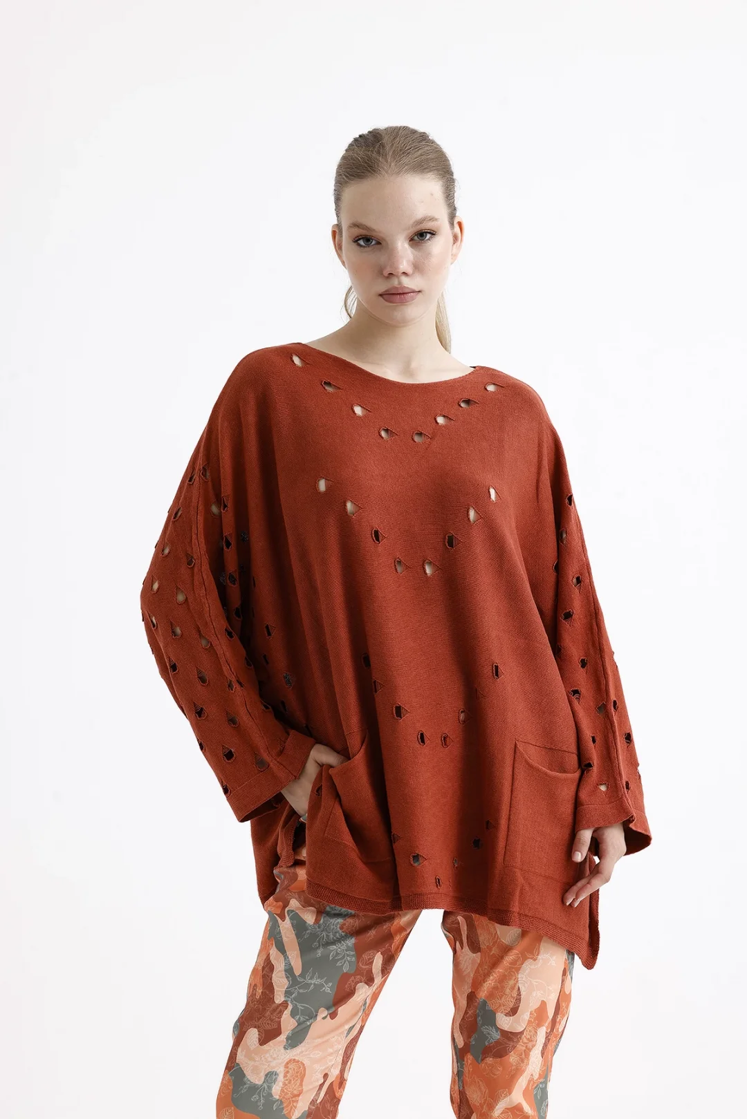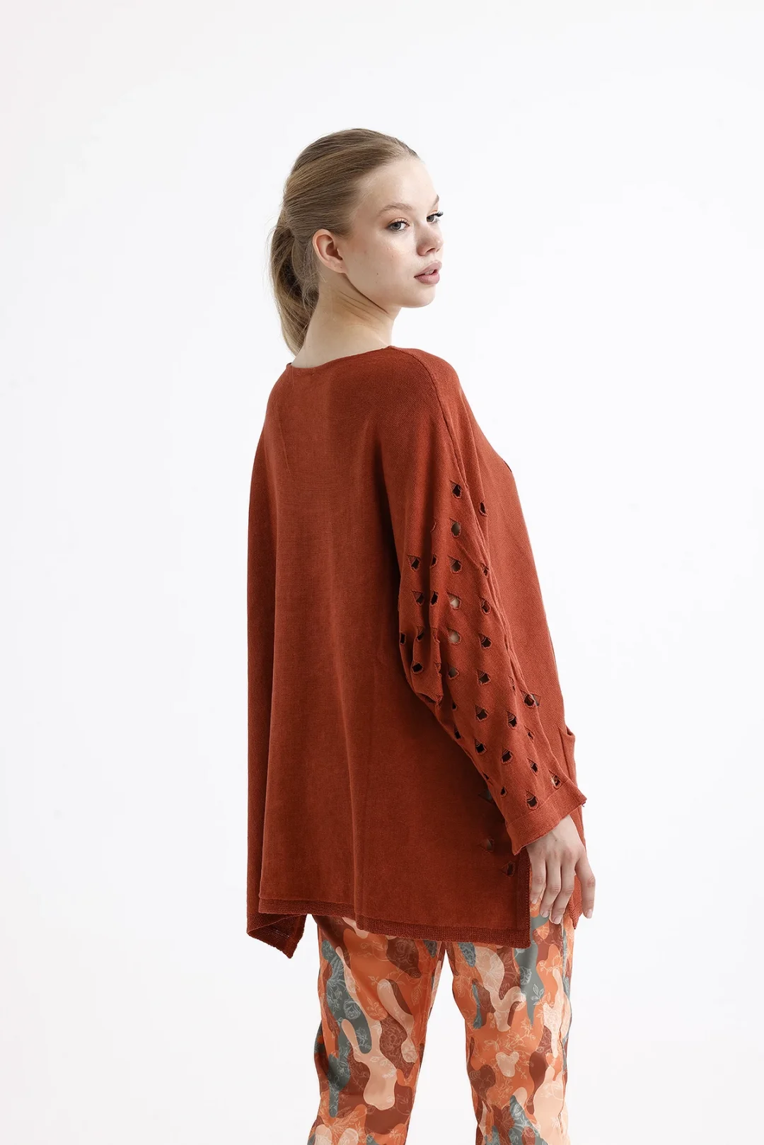 Pamuklu triko yırtıklı kazak Kiremit rengiyle şıklığınıza şıklık katacak! 38-52 beden uyumludur.