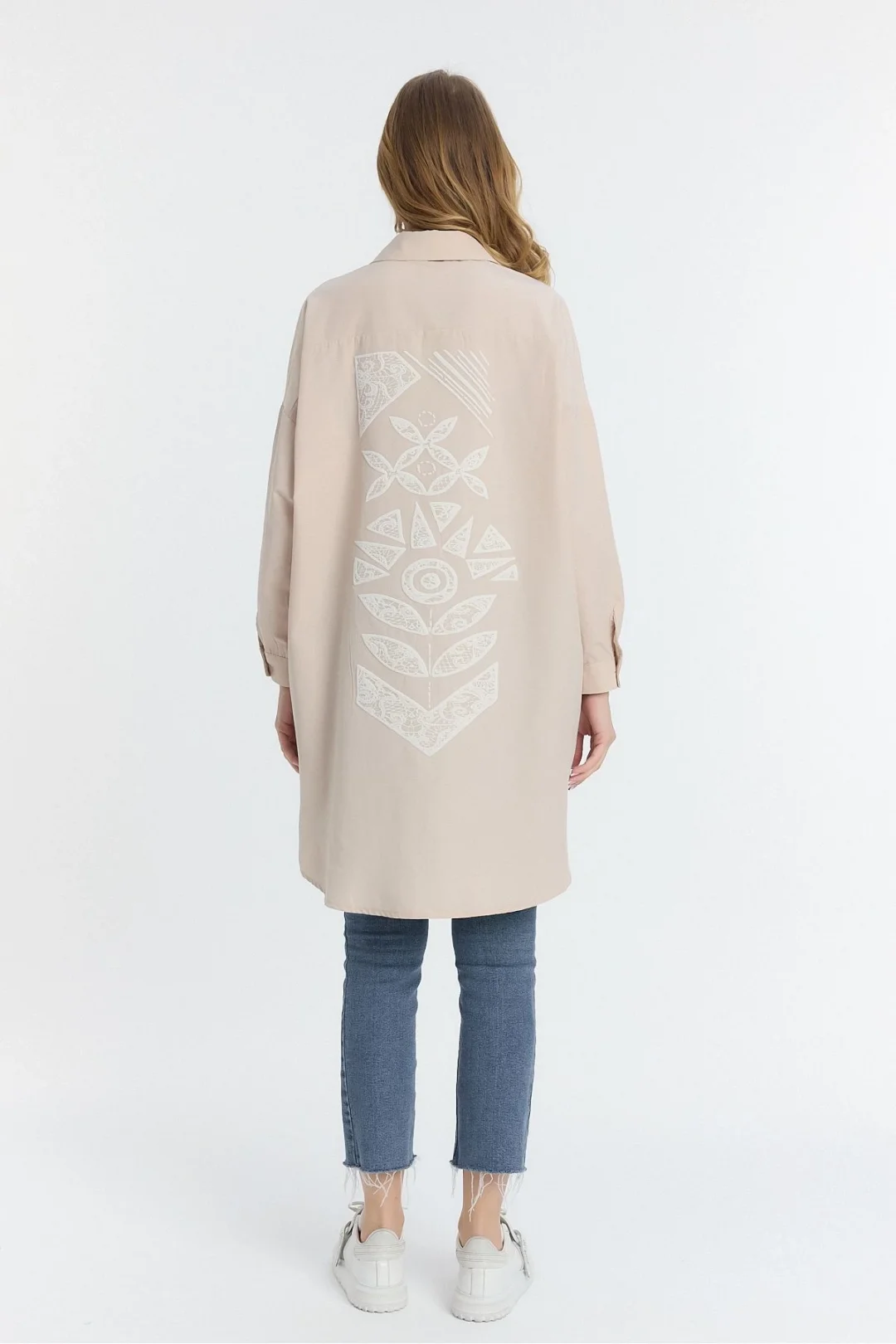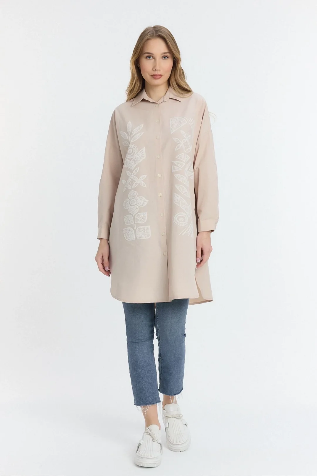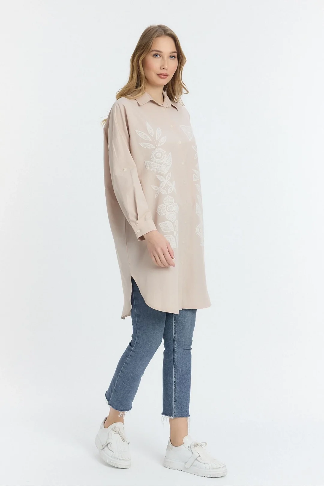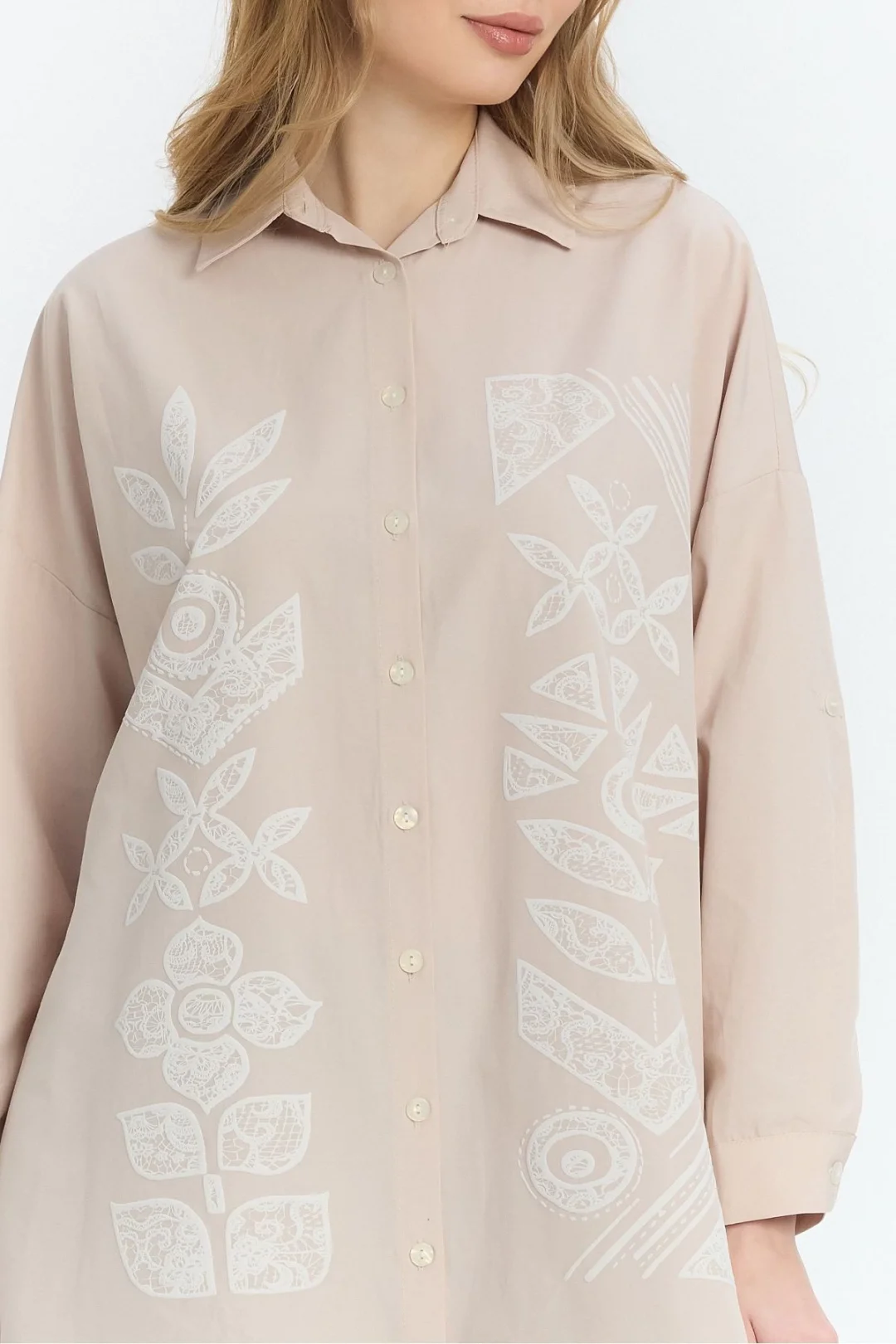 Şili çiçek figürlü oversize kadın gömlek-Bej