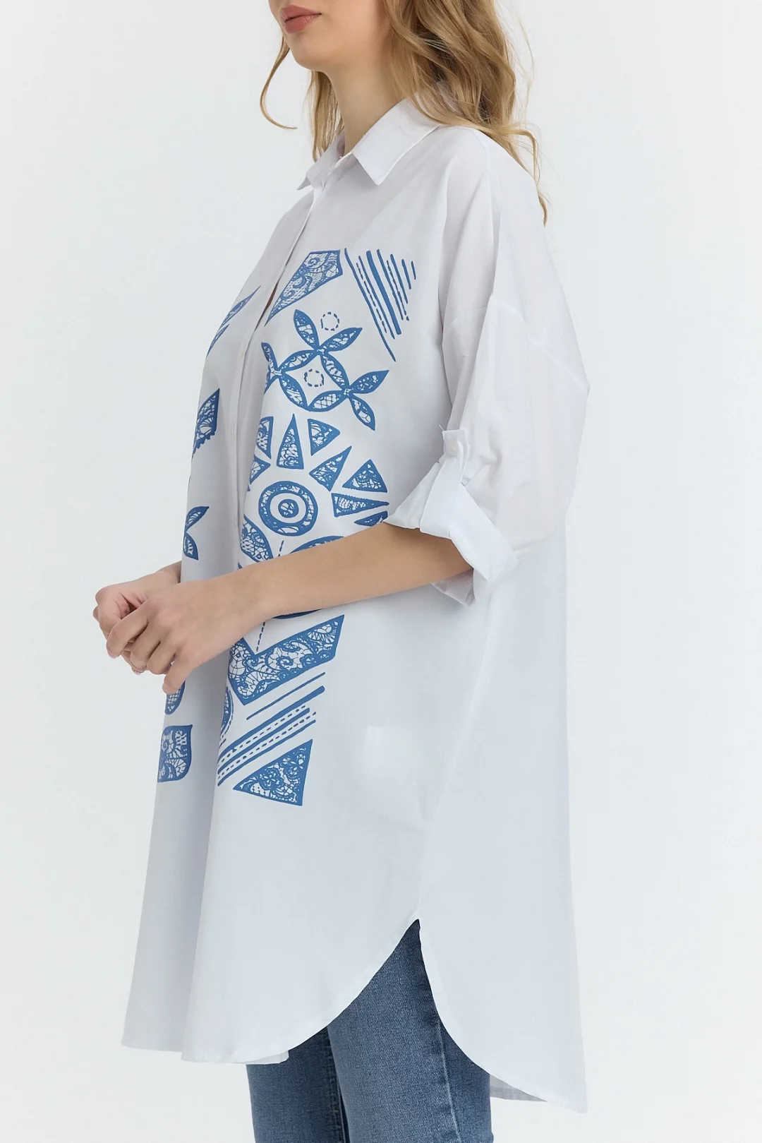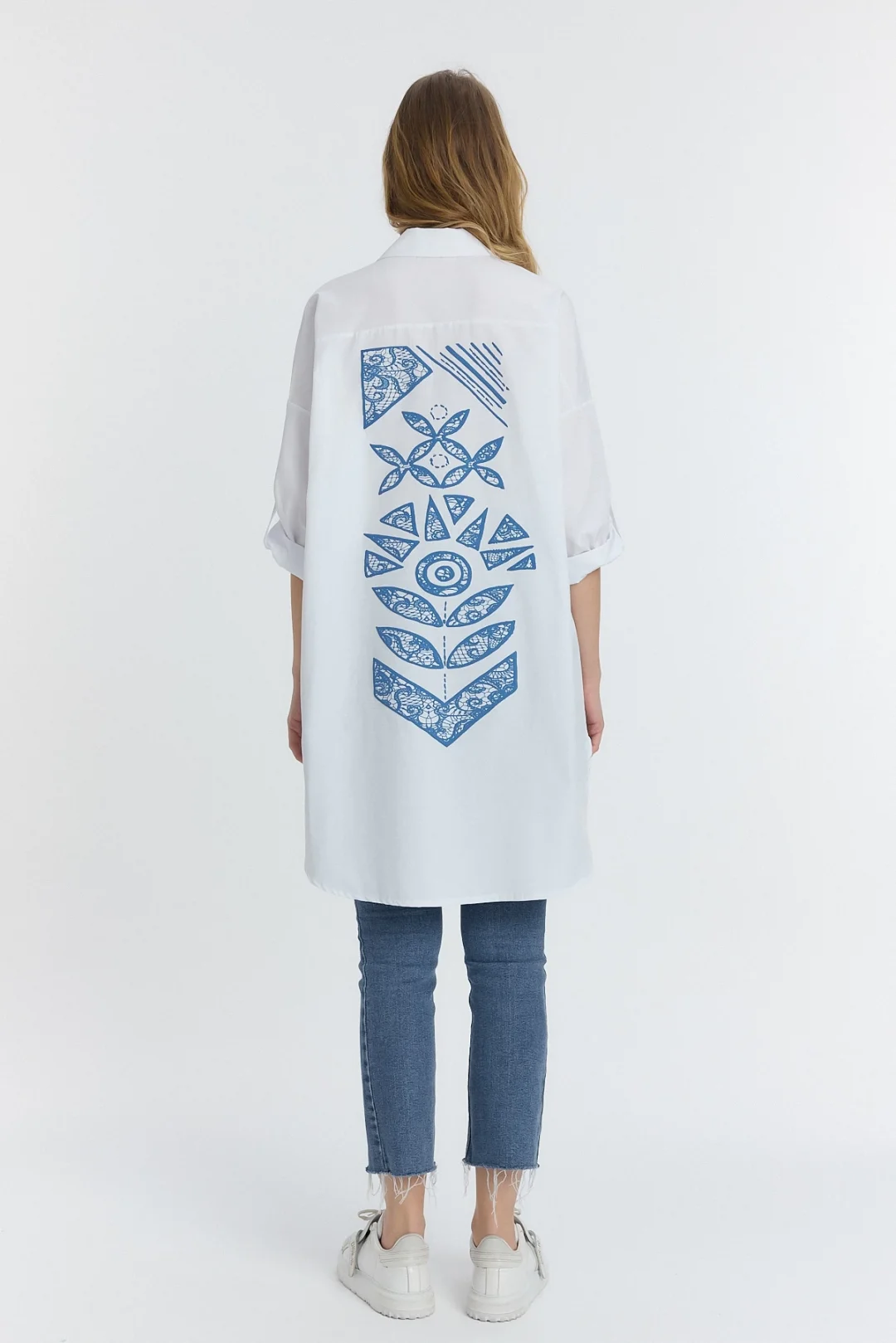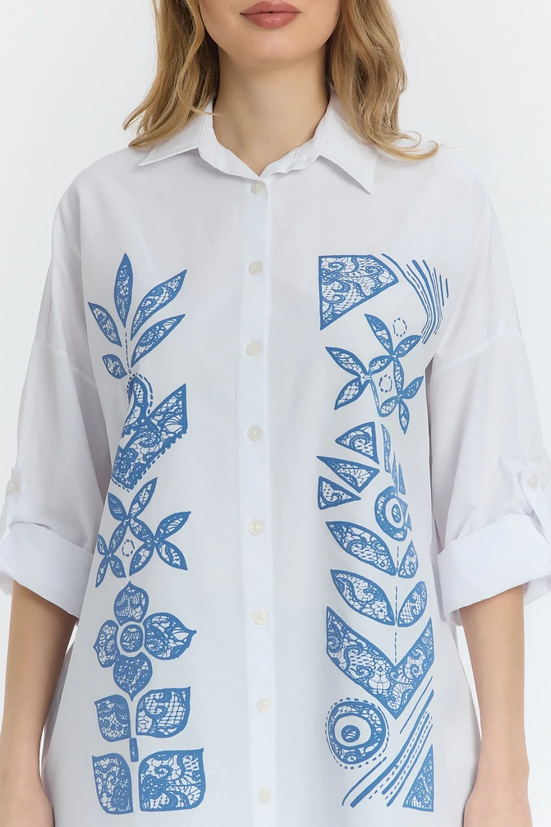 Şili çiçek figürlü oversize kadın gömlek-Beyaz
