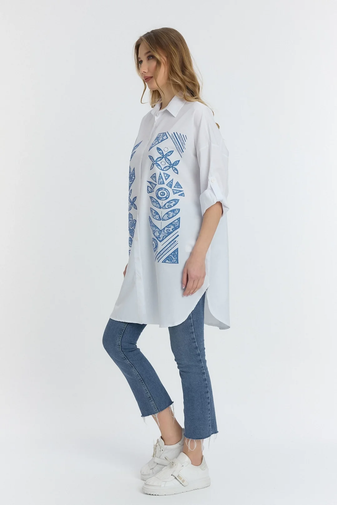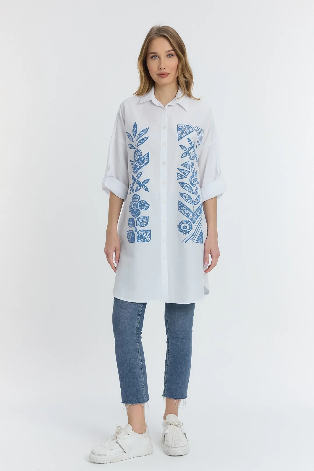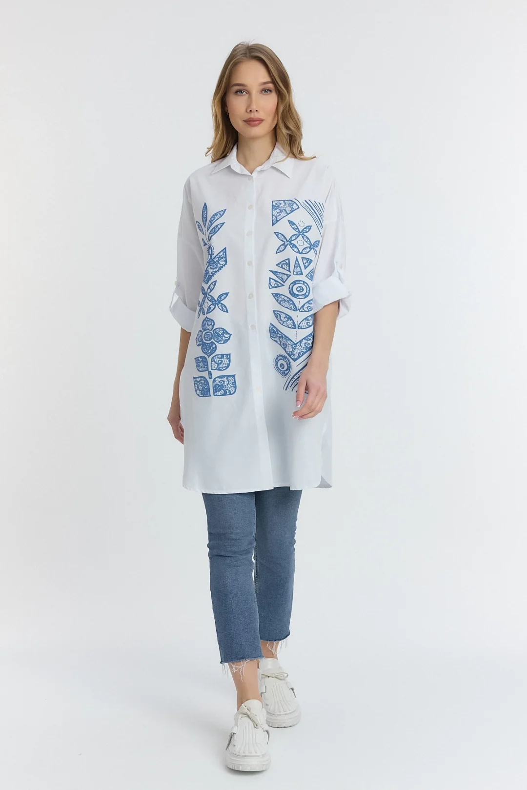 Şili çiçek figürlü oversize kadın gömlek-Beyaz