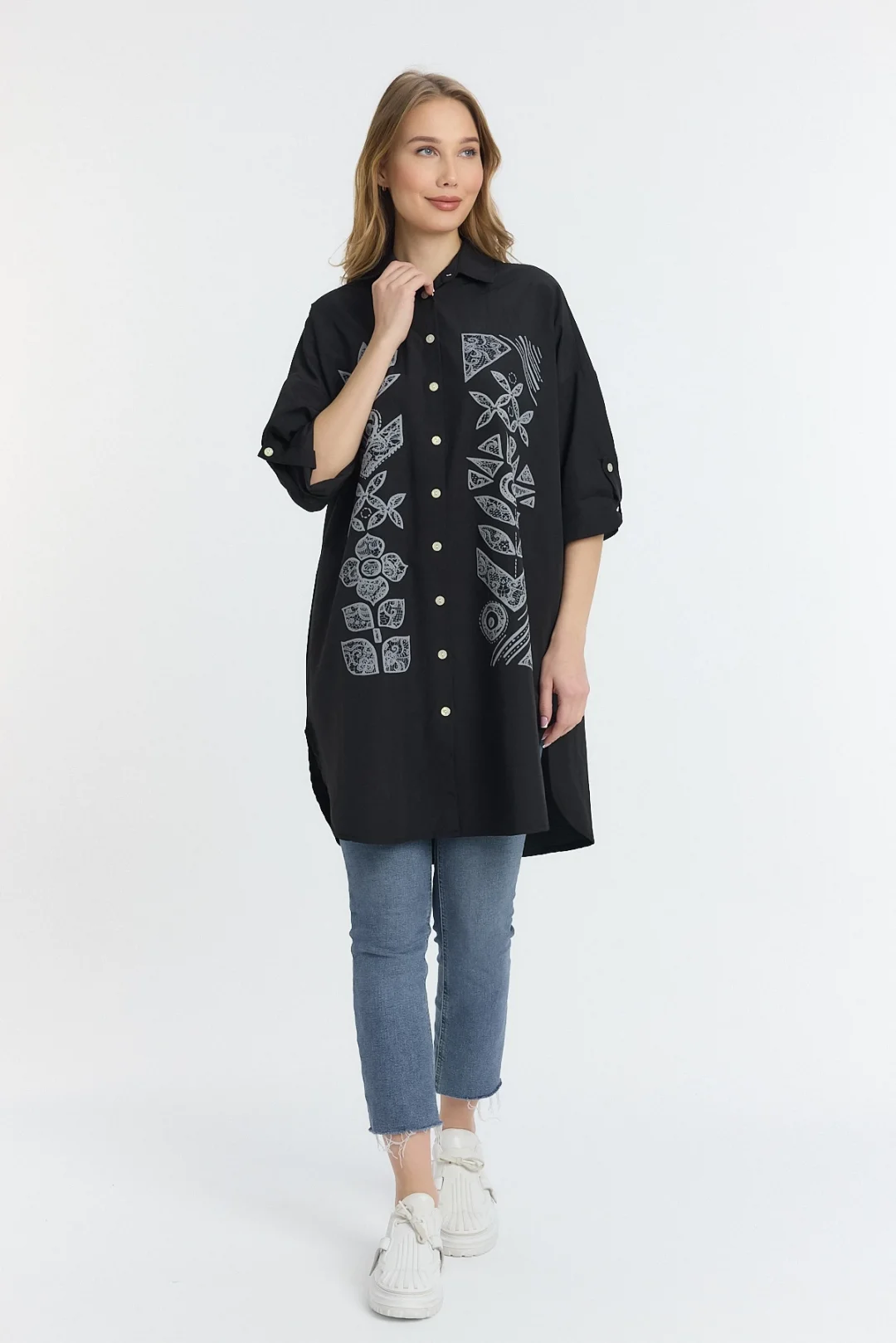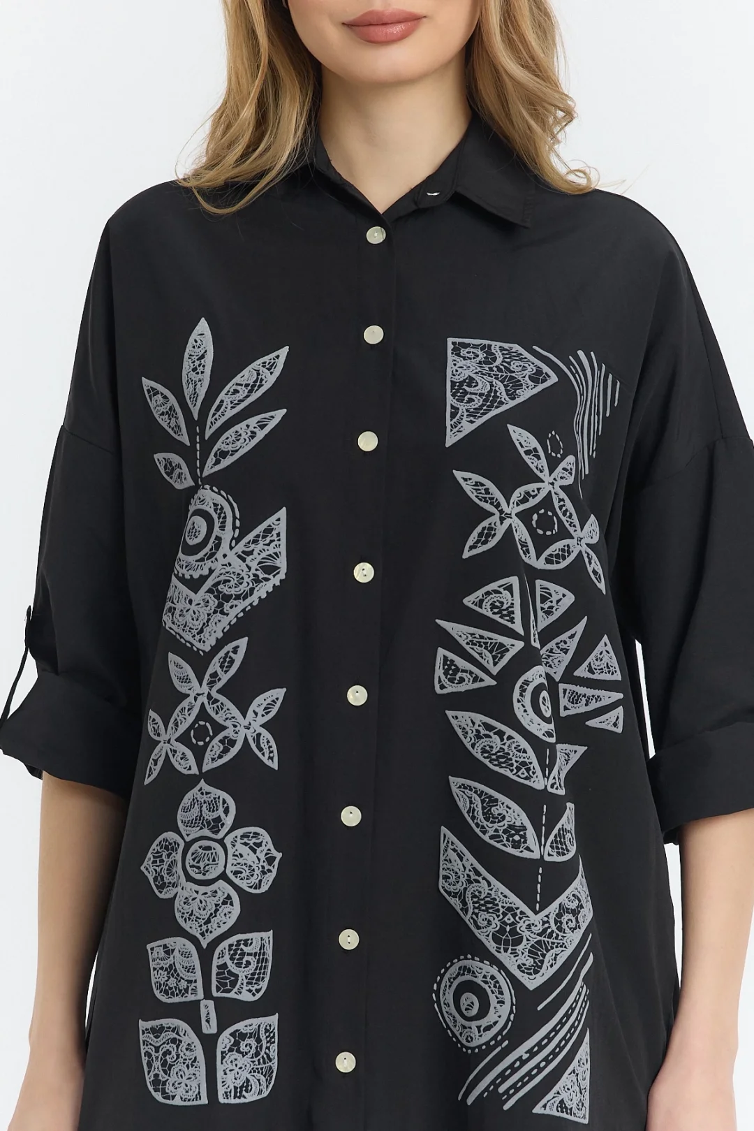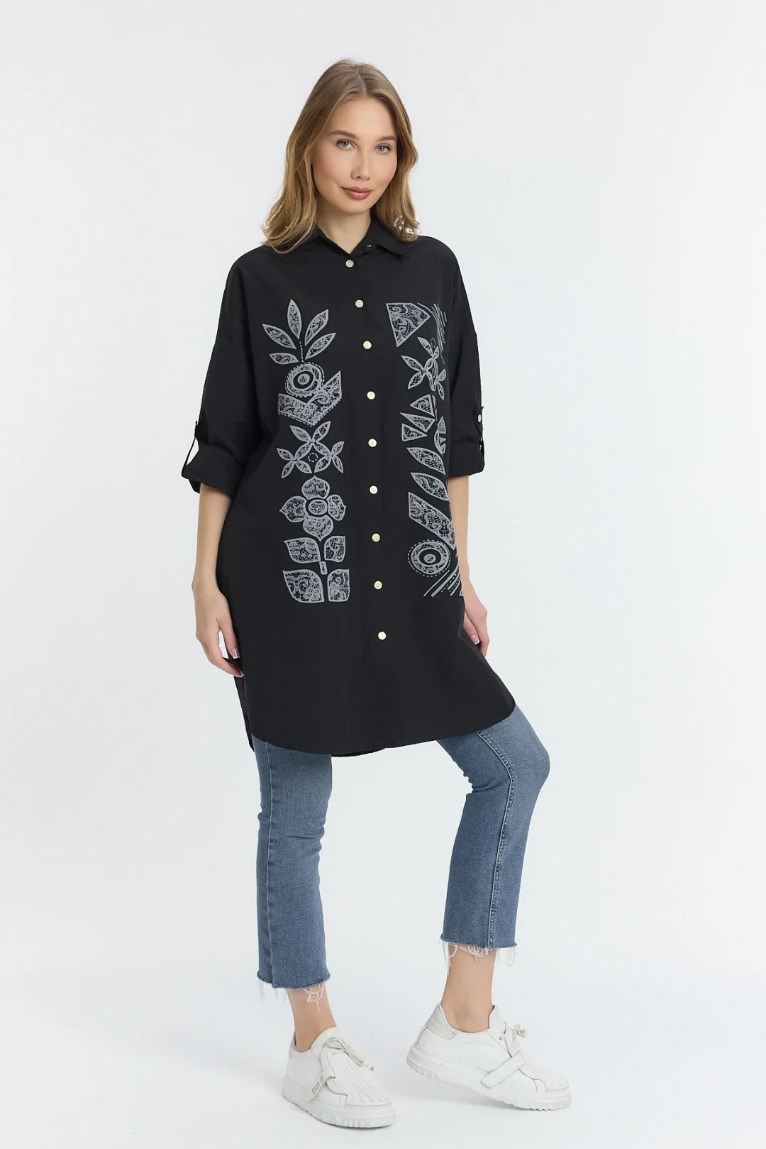 Şili çiçek figürlü oversize kadın gömlek-Siyah