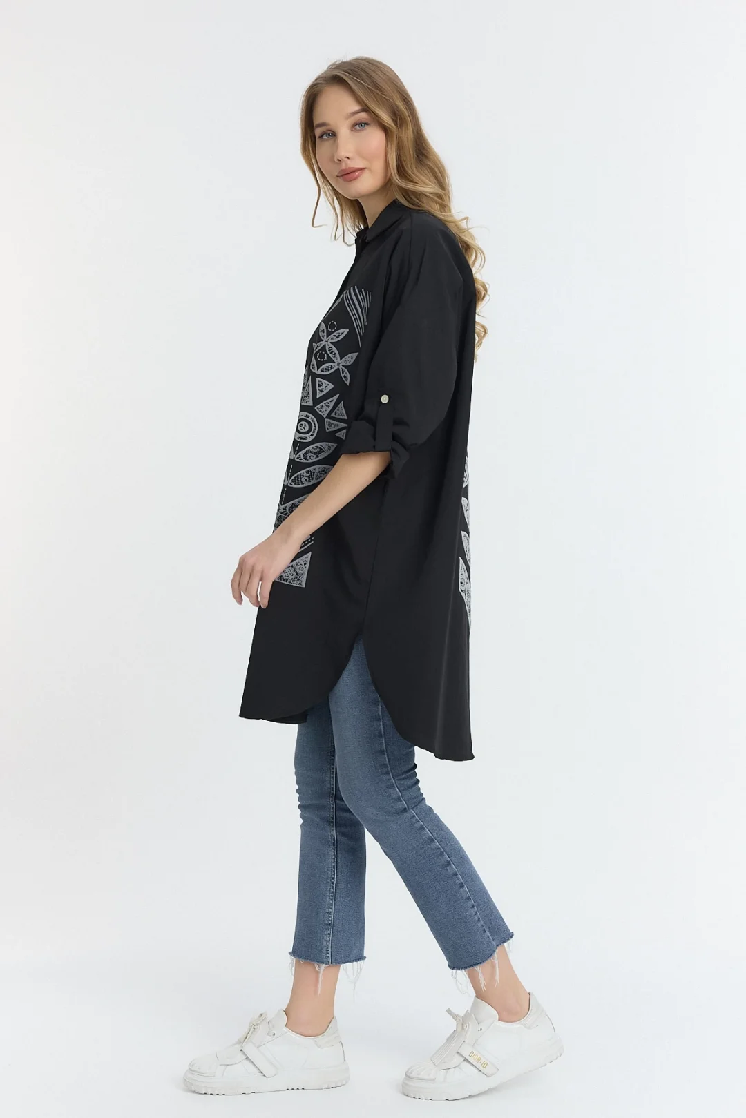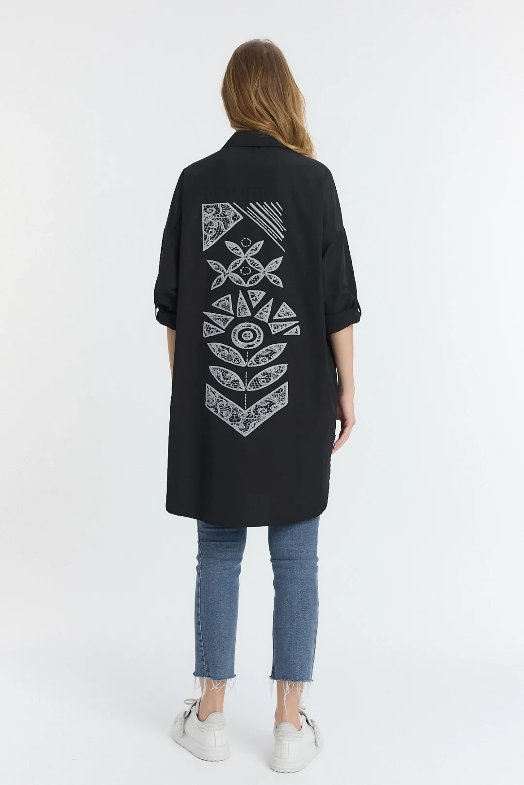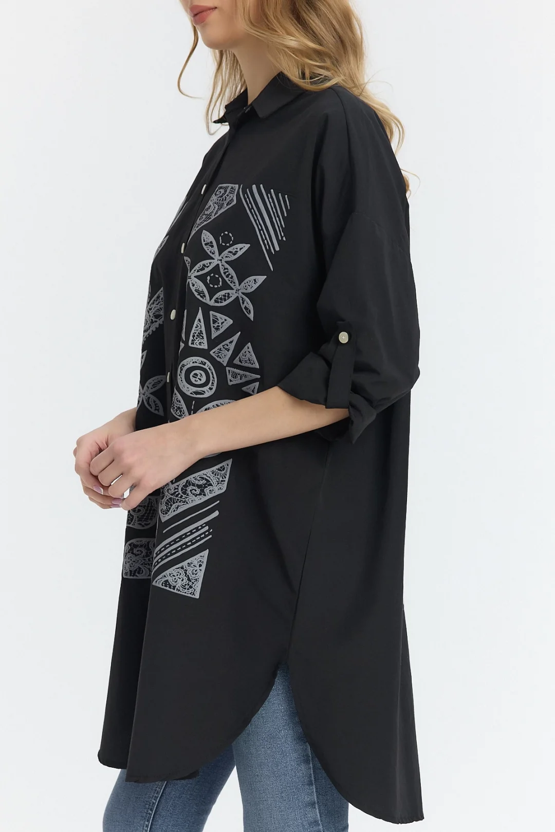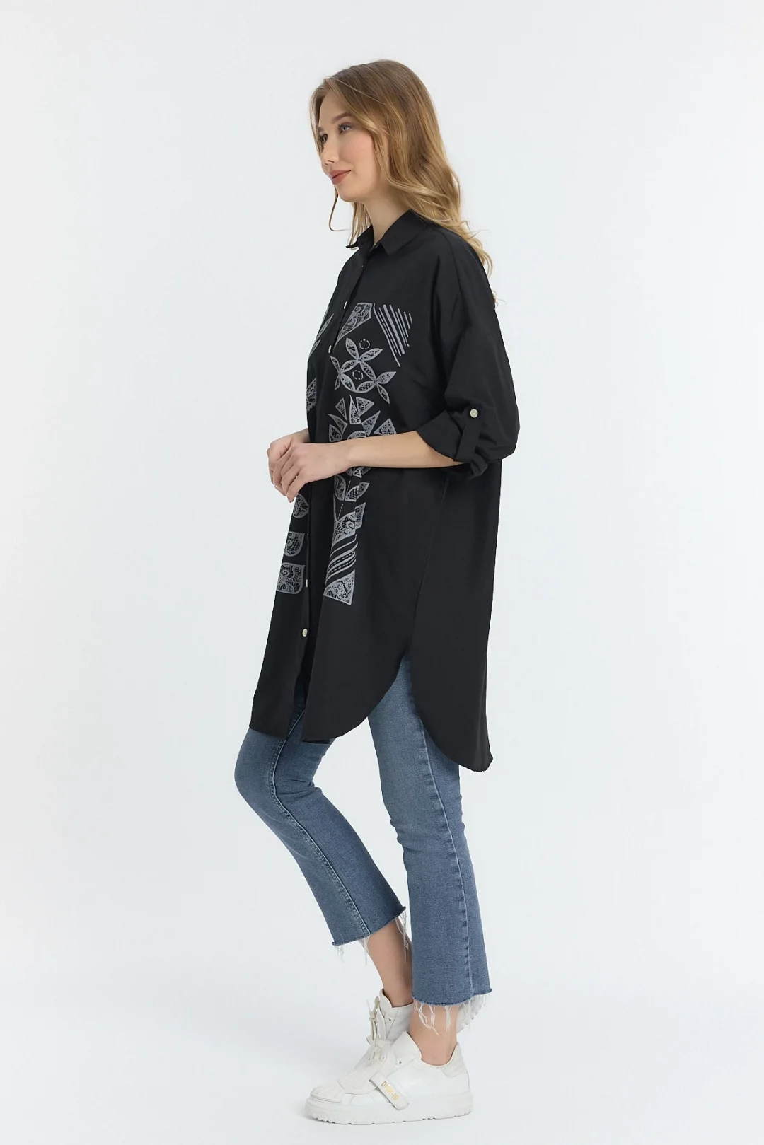 Şili çiçek figürlü oversize kadın gömlek-Siyah