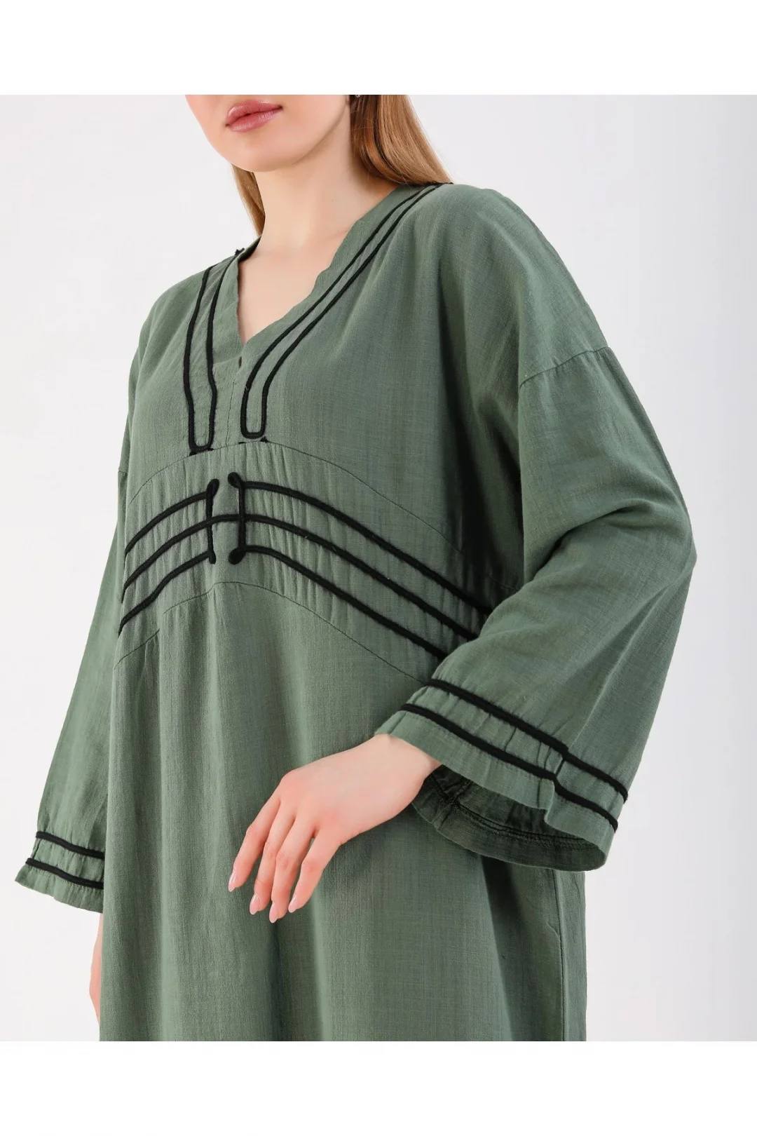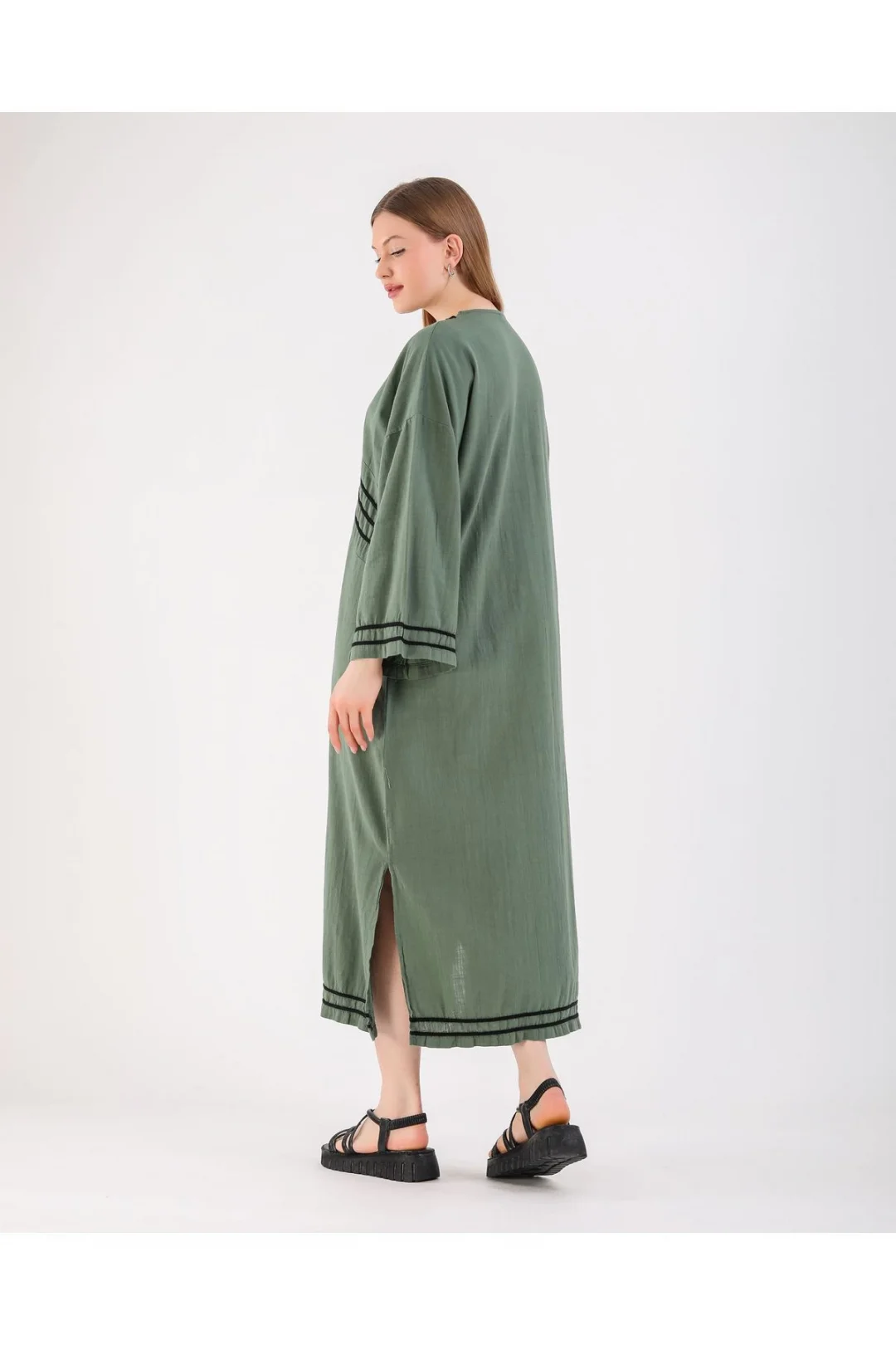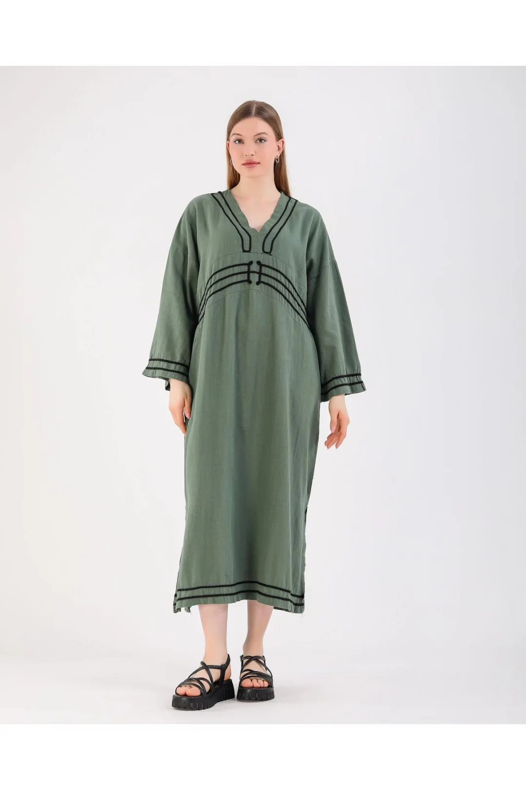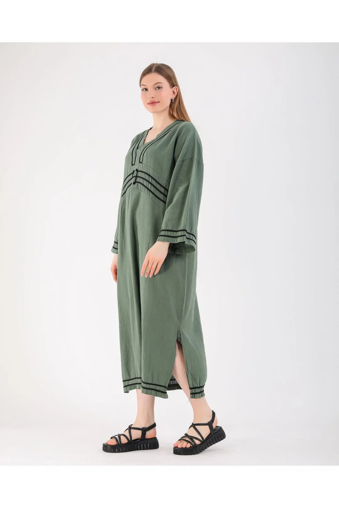 SUMEF markalı Süzeneli Midiboy Pamuk Kadın Elbise-Haki, rahat ve şık bir tercih sunar.
