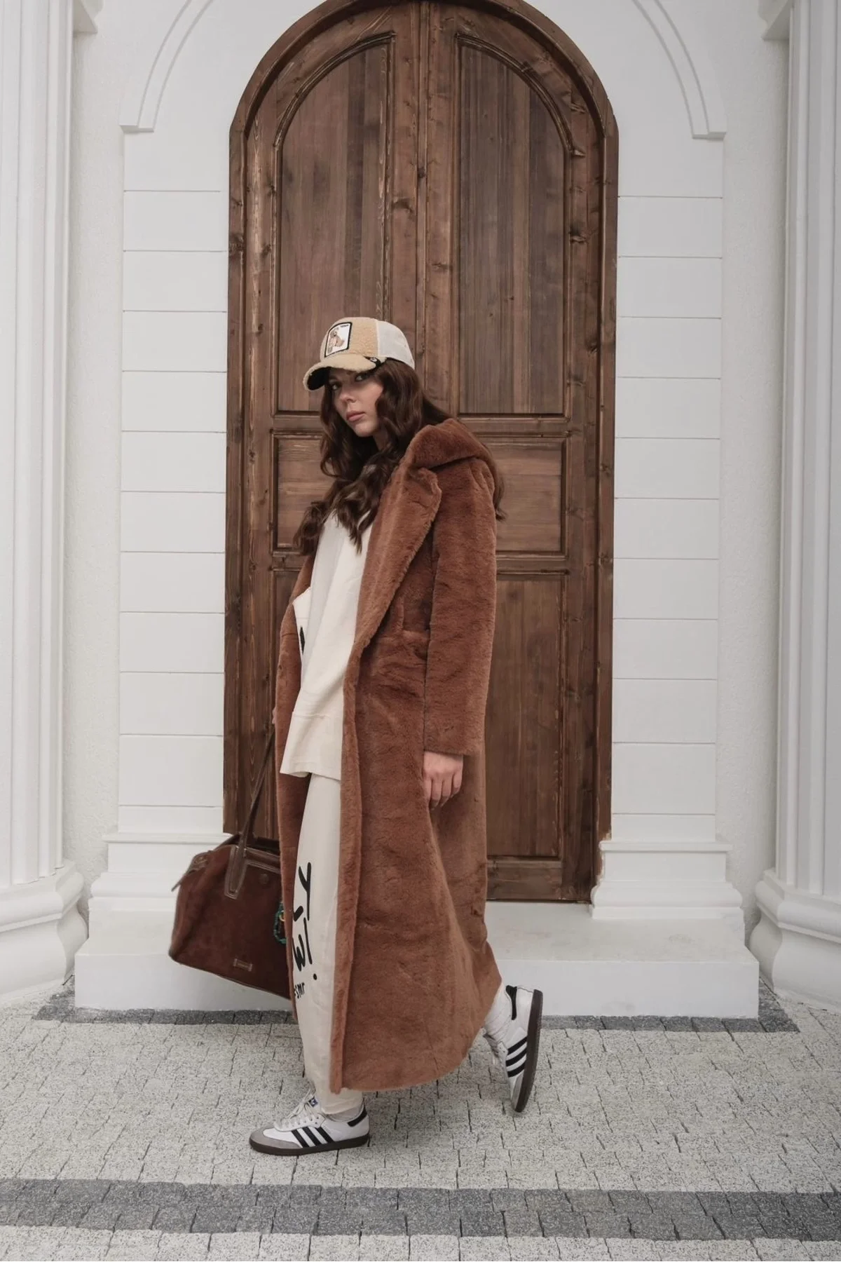 Kadın Peluş Uzun Kaban - Kapüşonlu Oversize Kürk Mont - 38-46 Beden Uyumlu - Yumuşak Kışlık