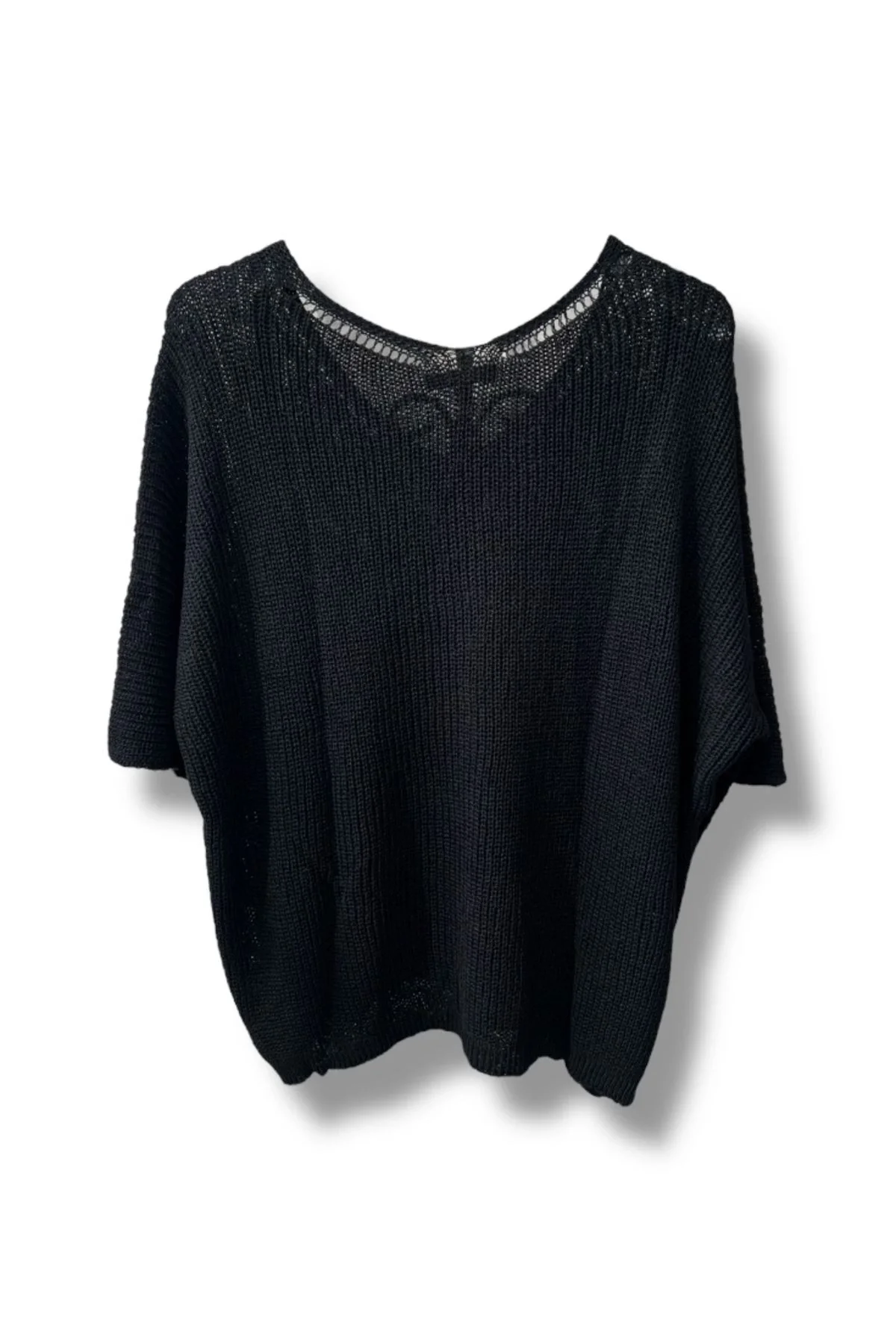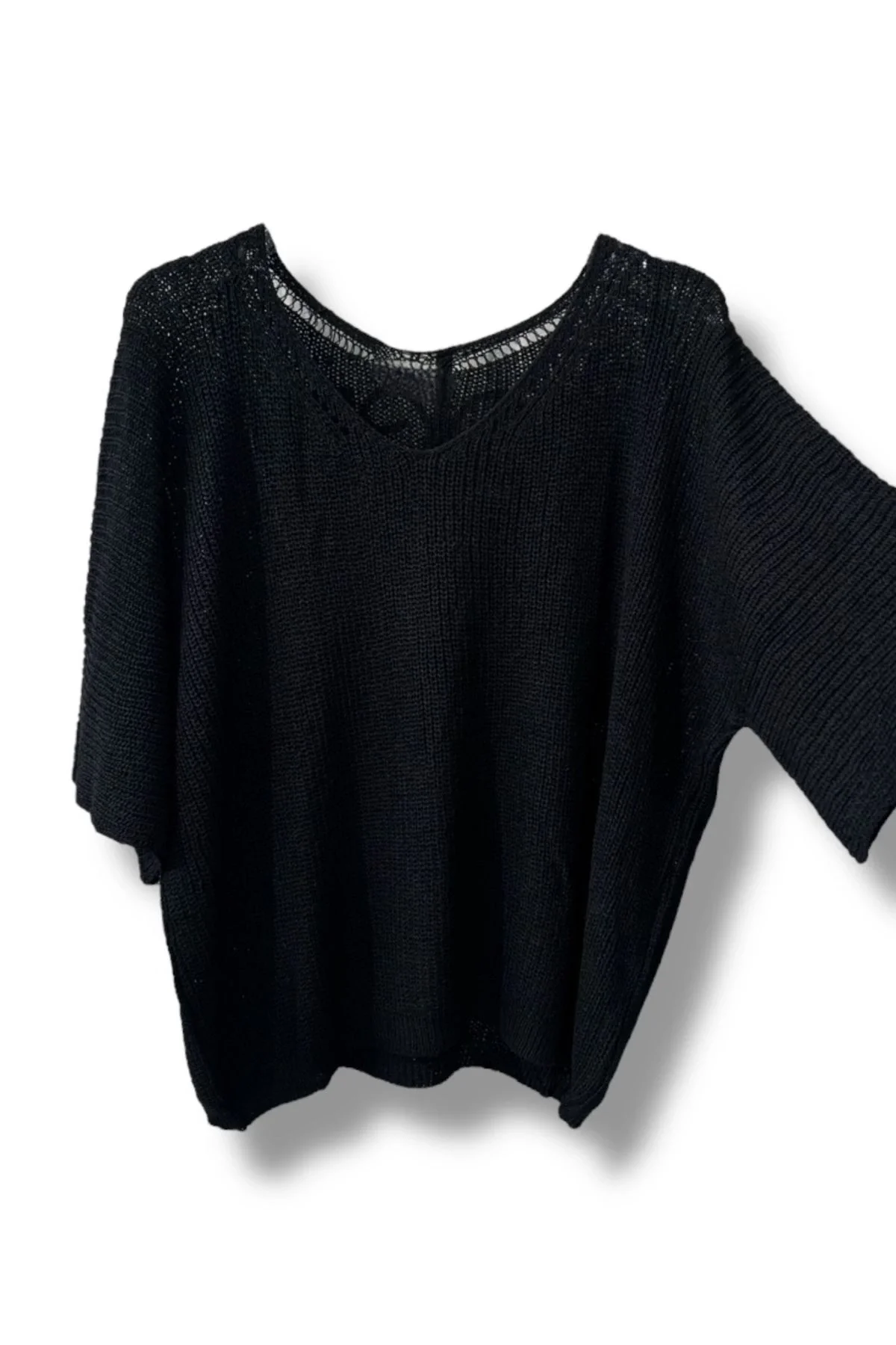 Oversize Ajurlu Merserize Triko Bluz Kadın V Yaka-siyah