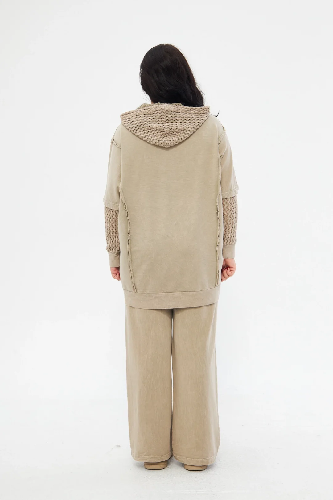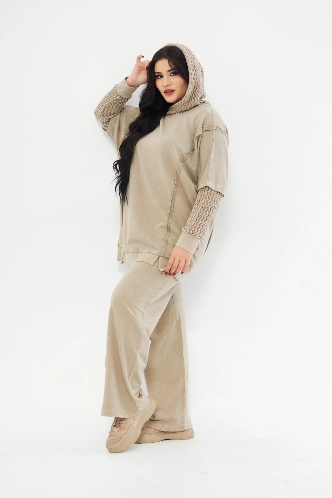 Uzun kol triko detay kapüşonlu takım-Krem