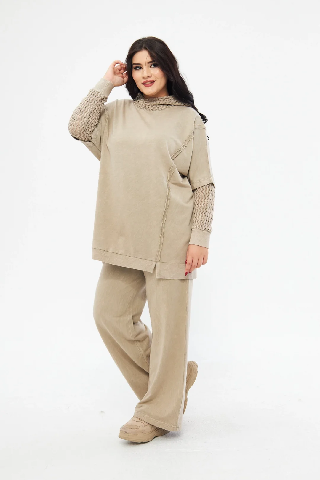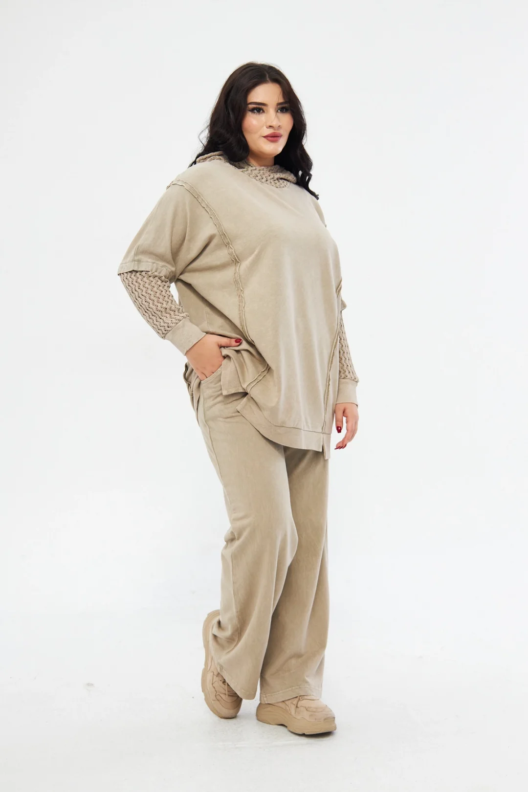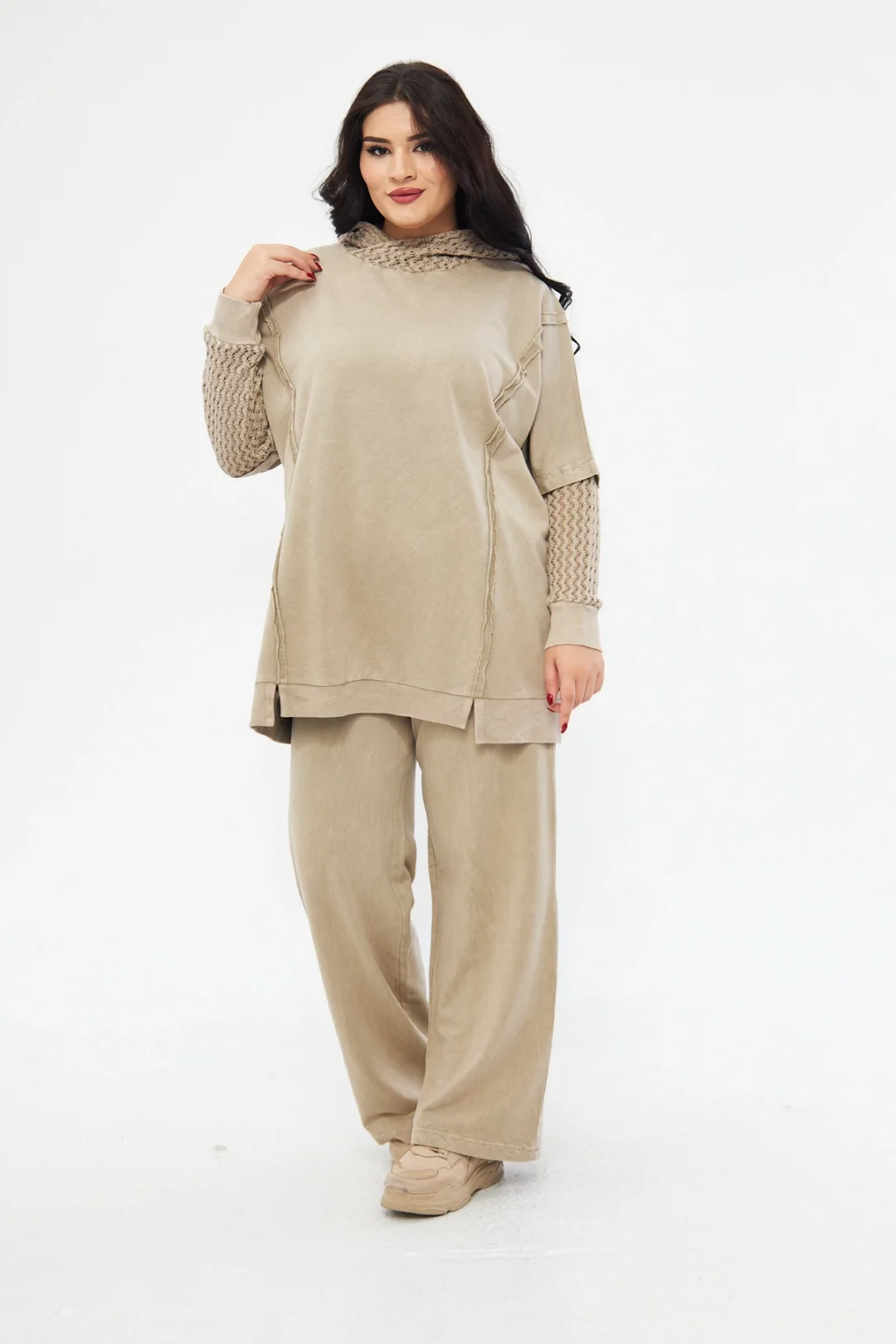 %100 pamuk kumaş, pamuk iplikten örülmüş triko ile kombinlenen kapüşonlu takım! Konforu ve doğallığı keşfedin.