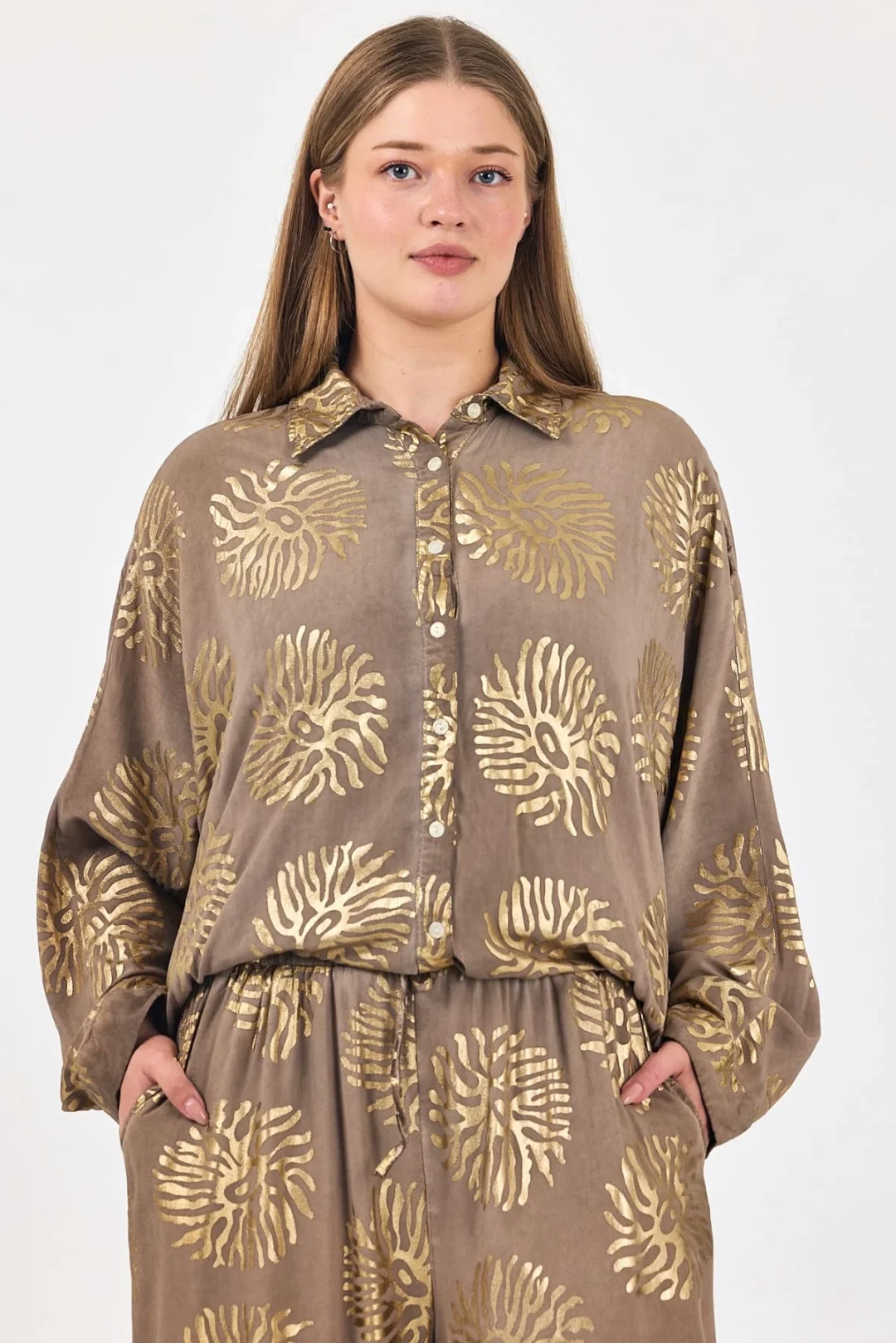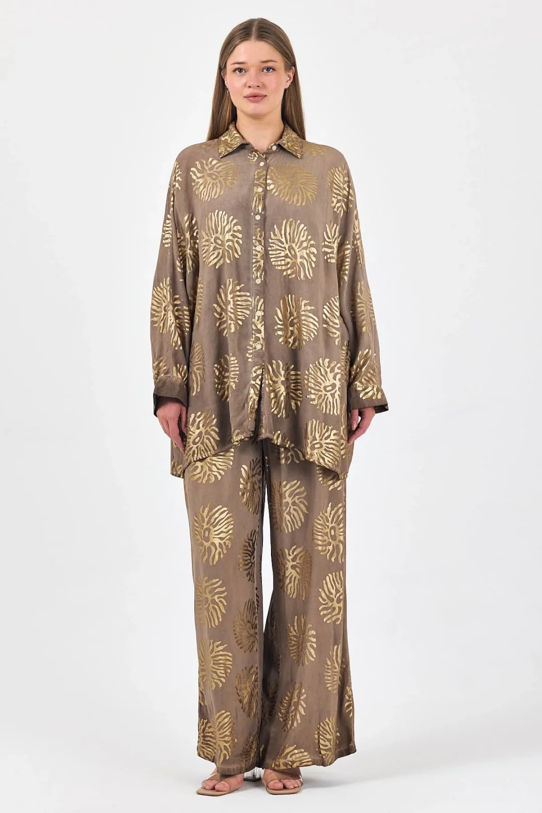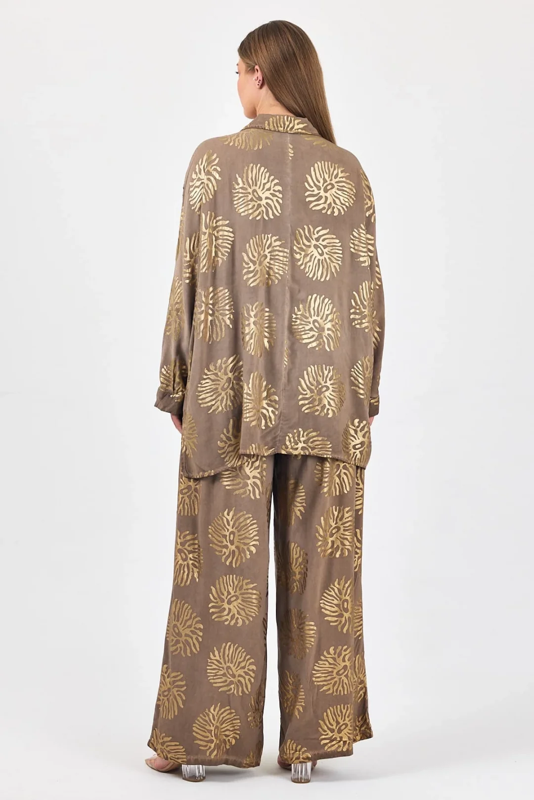Varaklı desenli kadın takım-kahve