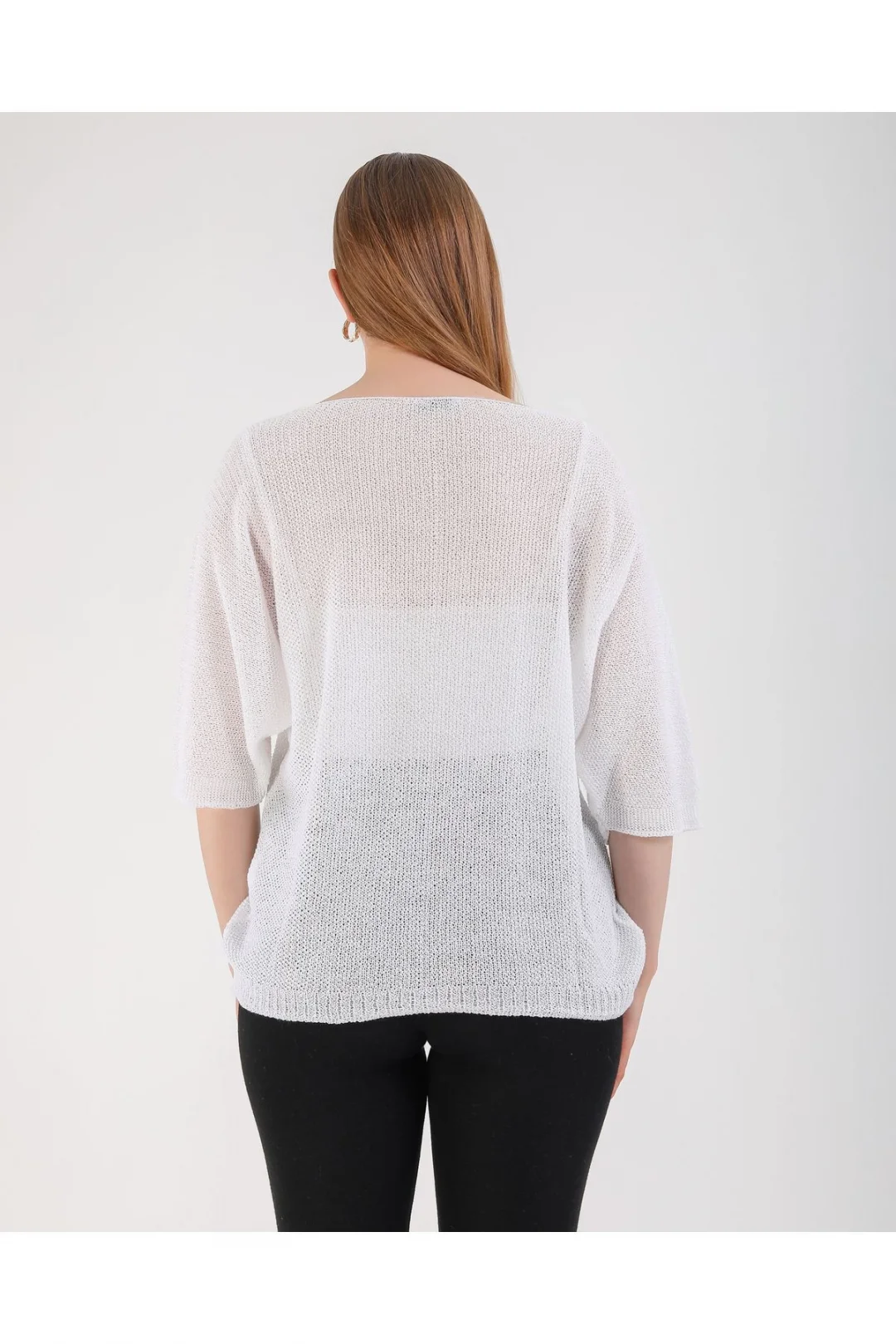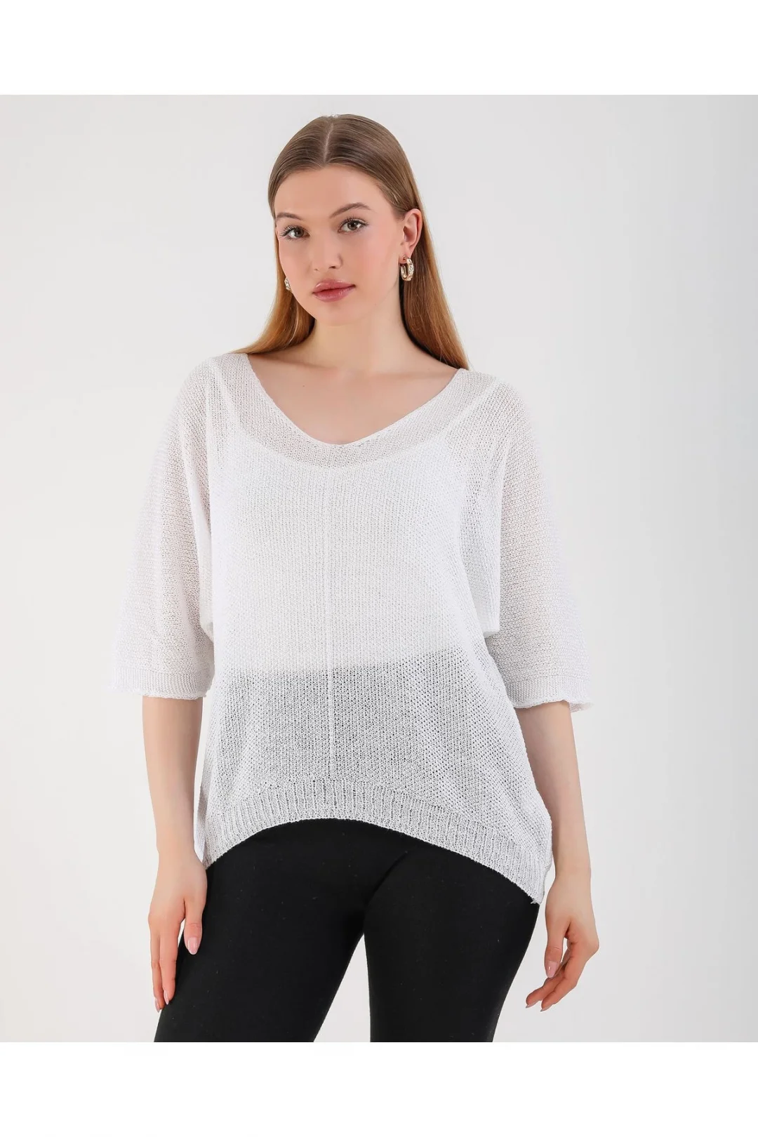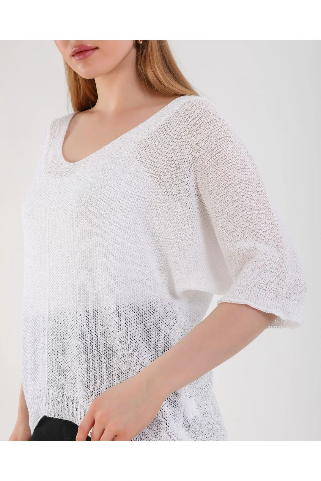 beyaz yarasa v yaka ince triko kadın bluz şıklığı ve rahatlığı bir arada sunuyor.